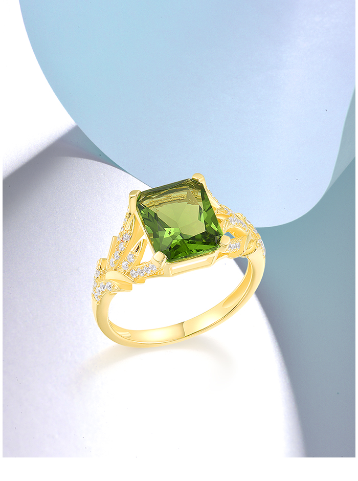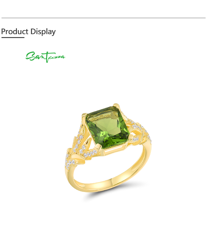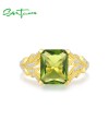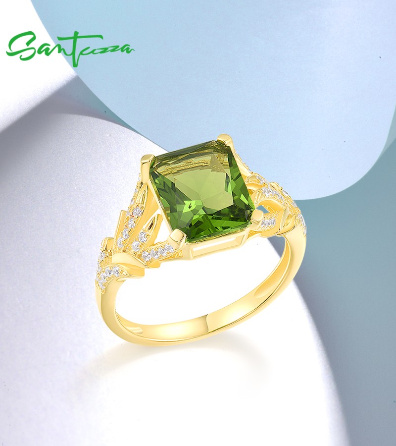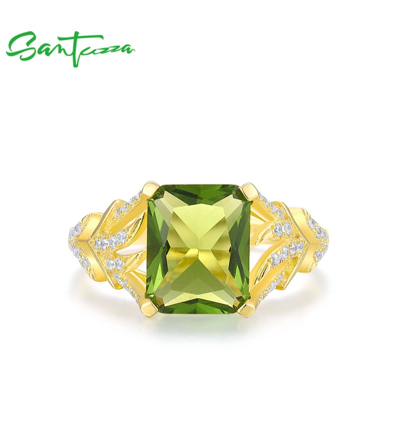 SANTUZZA 925 Sterling Silver Ring Green Glass White Cubic Zirconia Yellow Plated Fine Jewelry
