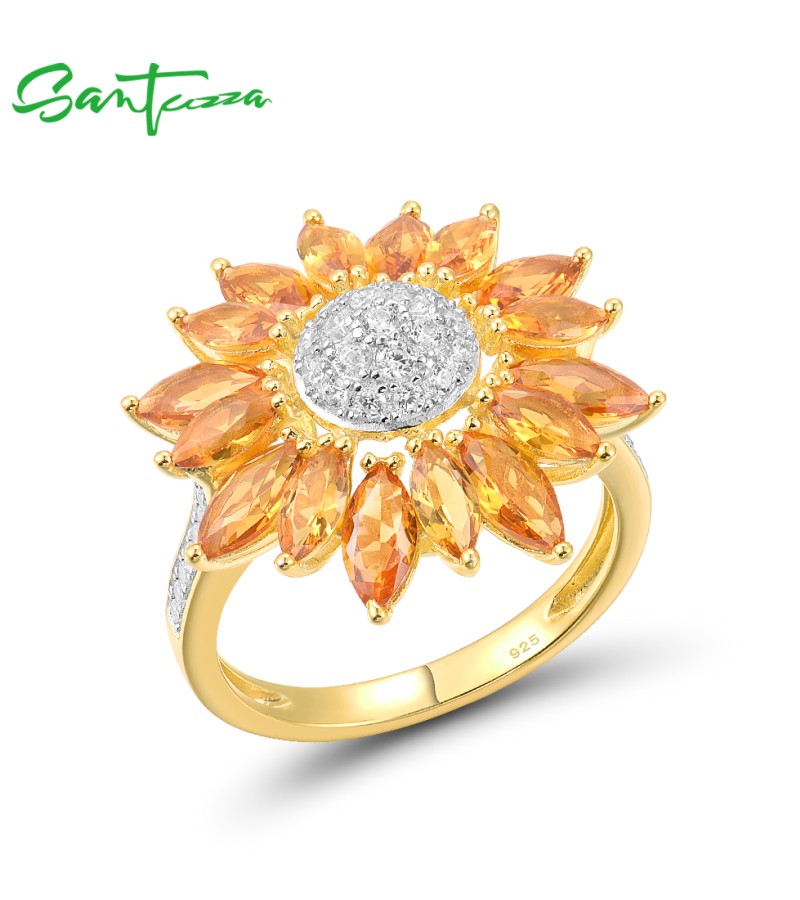 SANTUZZA Silver Ring 925 Sterling Silver Yellow Nano &White Cubic Zirconia Gold Color Sun Flower Jewelry