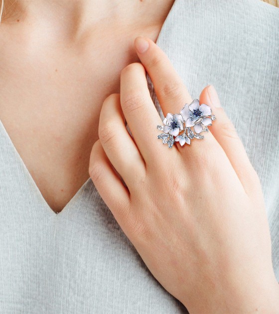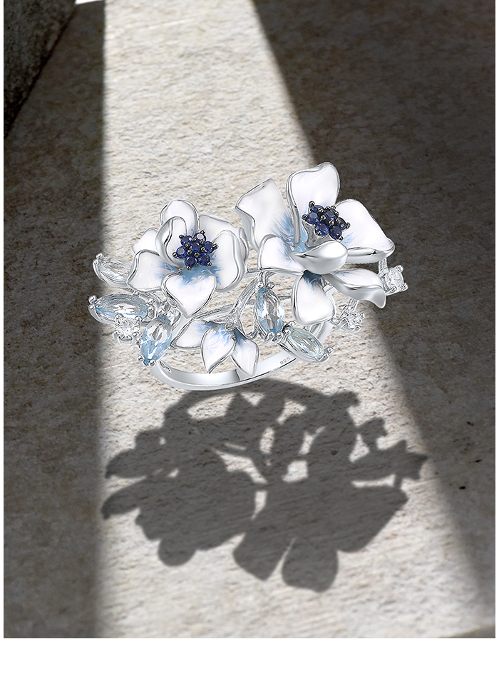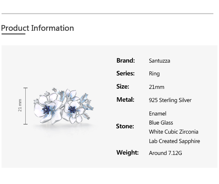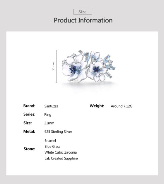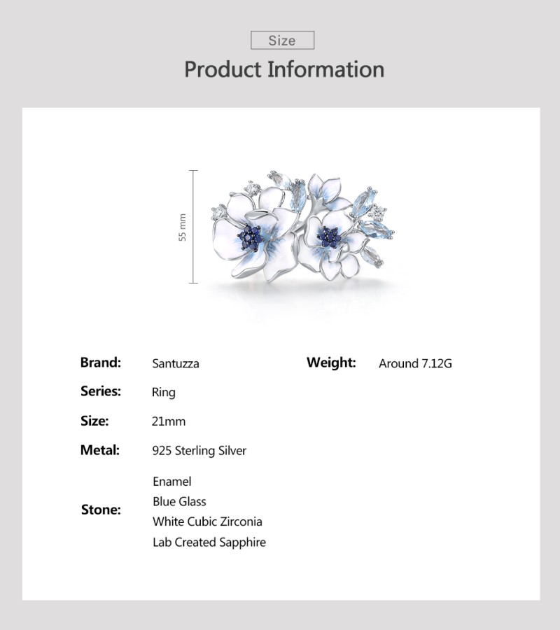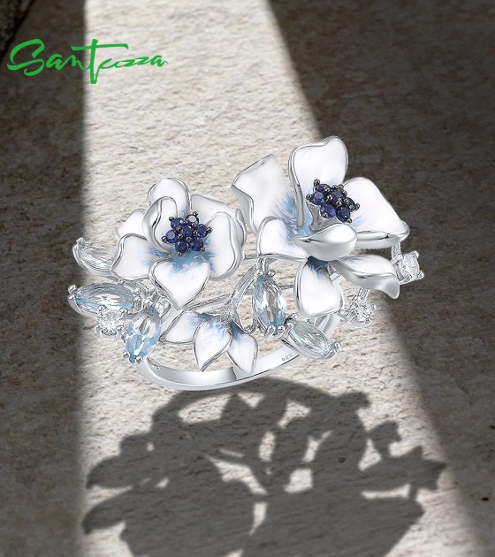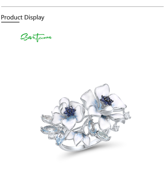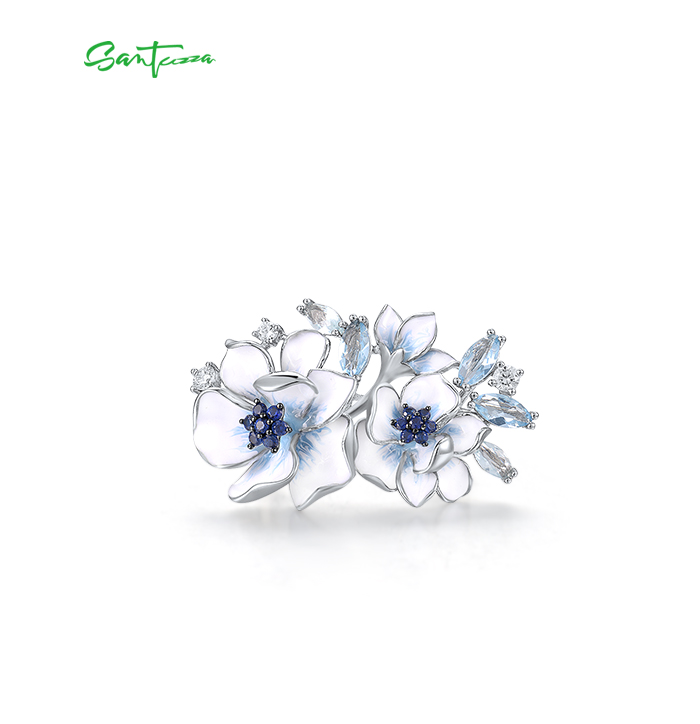SANTUZZA 925 Sterling Silver Rings Blue Stones White CZ Handmade Enamel Flower Ring Fine Jewelry
