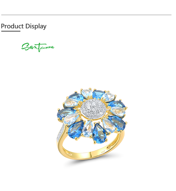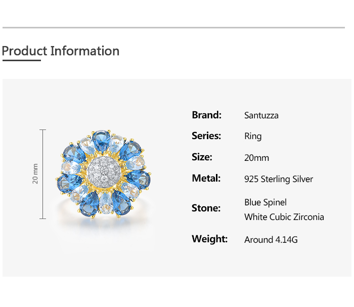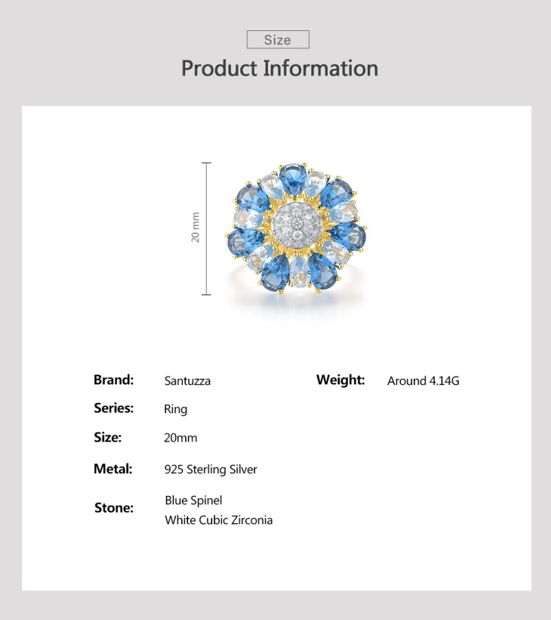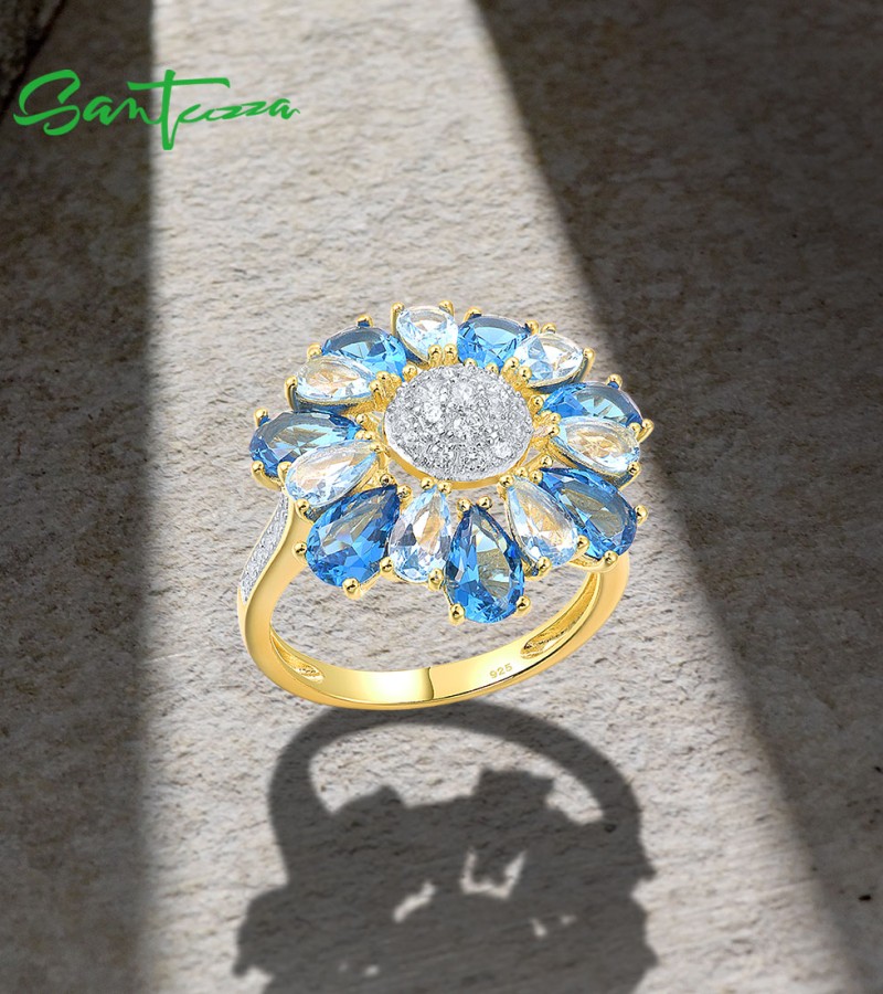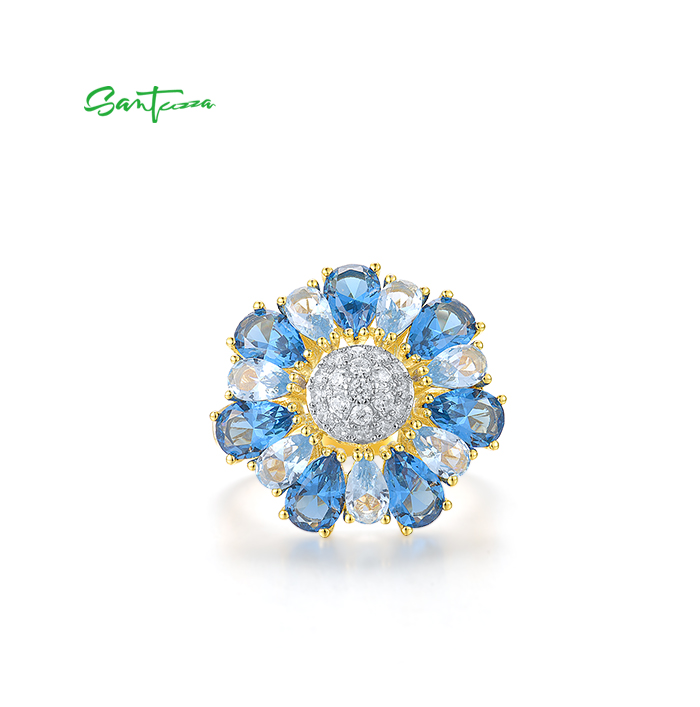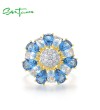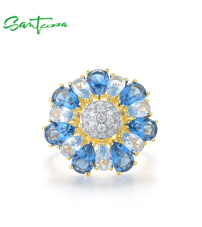 SANTUZZA Silver Ring 925 Sterling Silver White Cubic Zirconia Blue Spinel Gold Color Flower Jewelry