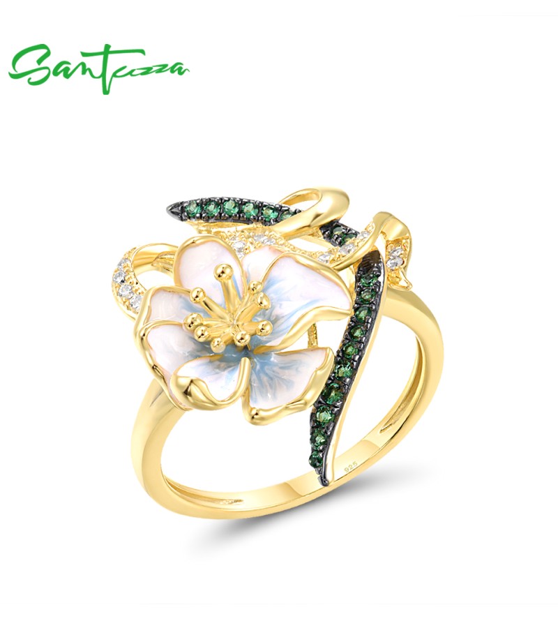 SANTUZZA 925 Sterling Silver Rings Green Spinel White CZ Handmade Enamel Flower Fine Jewelry