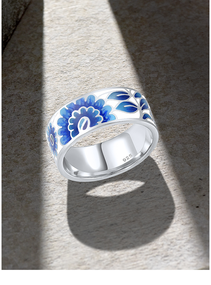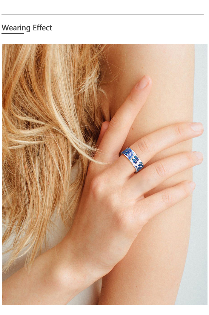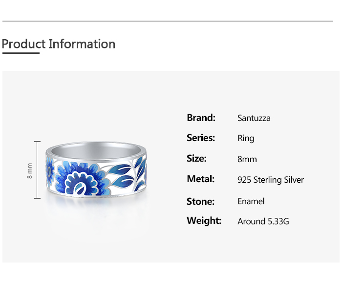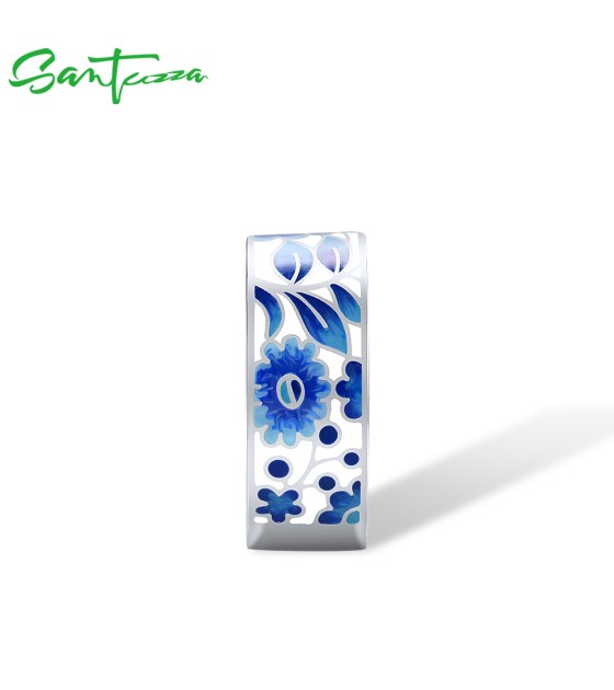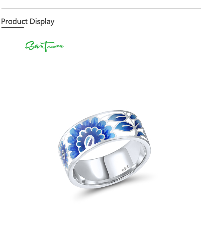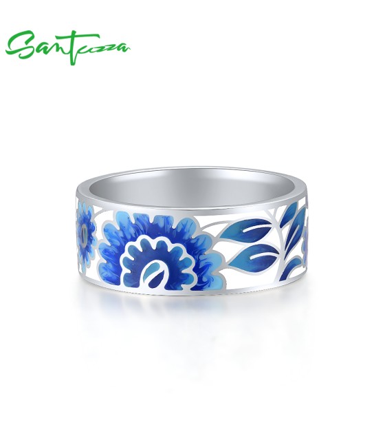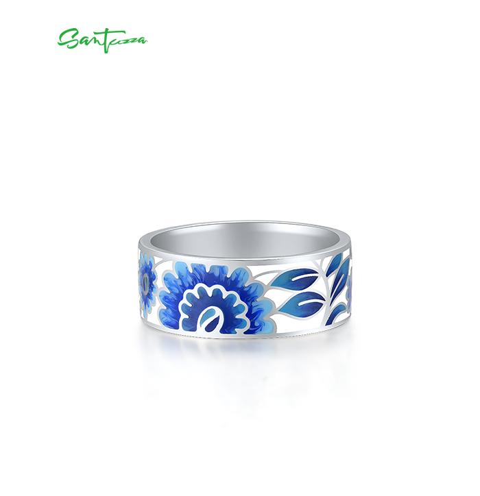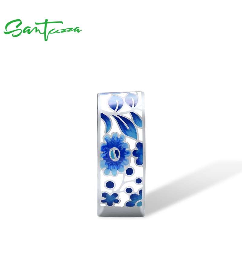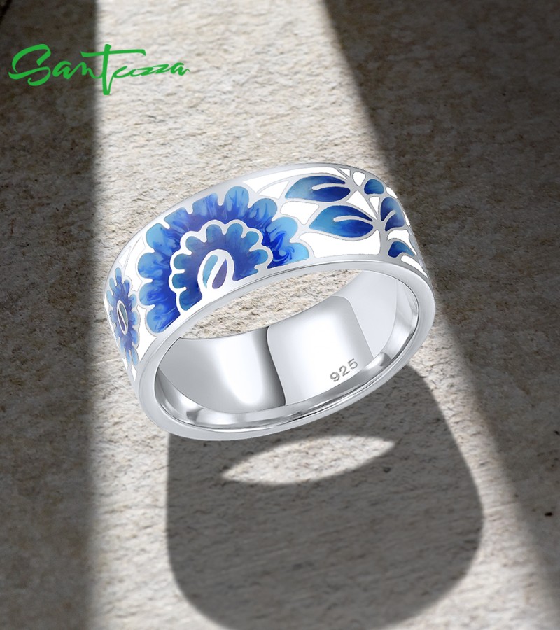 SANTUZZA Silver Rings 925 Sterling Silver Blue Enamel Flower Leaf Rings Jewelry