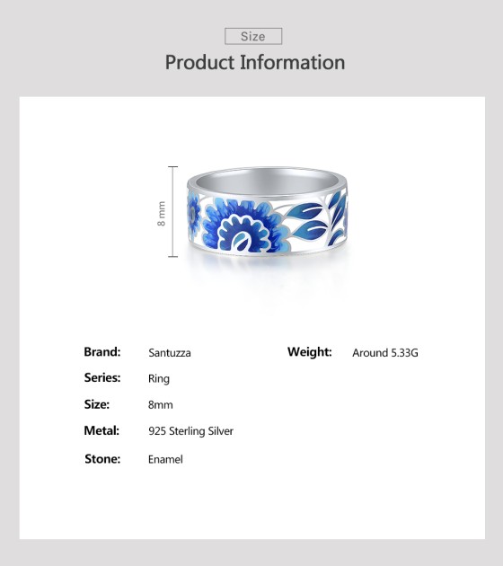 SANTUZZA Silver Rings 925 Sterling Silver Blue Enamel Flower Leaf Rings Jewelry - US 8