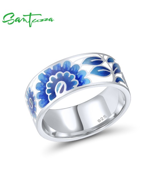 SANTUZZA Silver Rings 925 Sterling Silver Blue Enamel Flower Leaf Rings Jewelry
