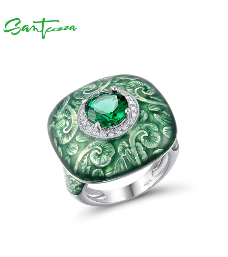 SANTUZZA 925 Sterling Silver Enamel Rings Green Glass White CZ Square Ring Fine Jewelry