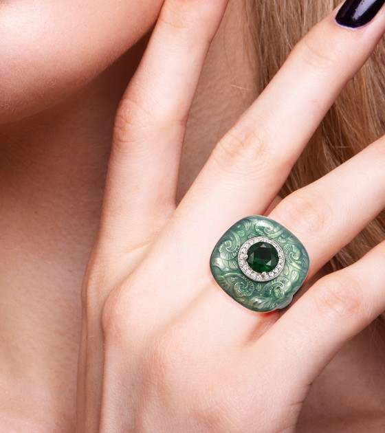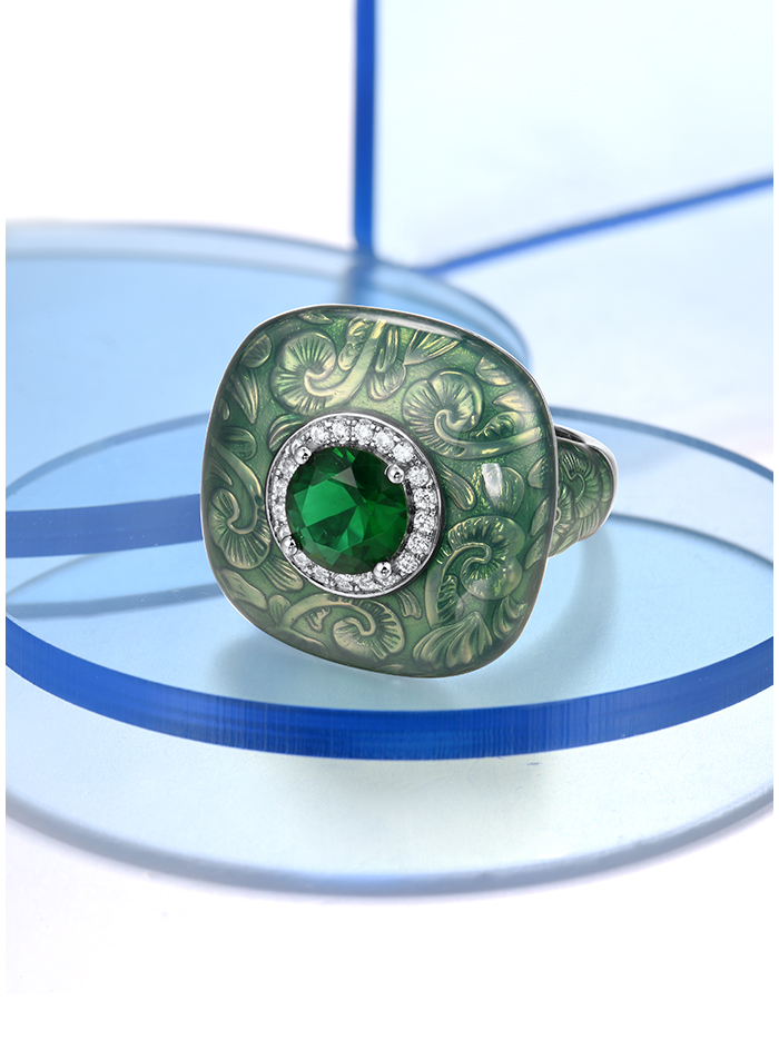 SANTUZZA 925 Sterling Silver Enamel Rings Green Glass White CZ Square Ring Fine Jewelry - US 9