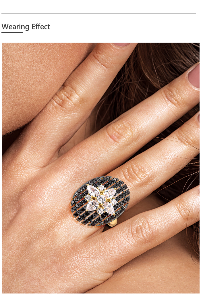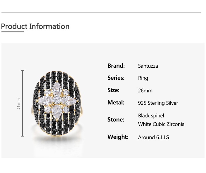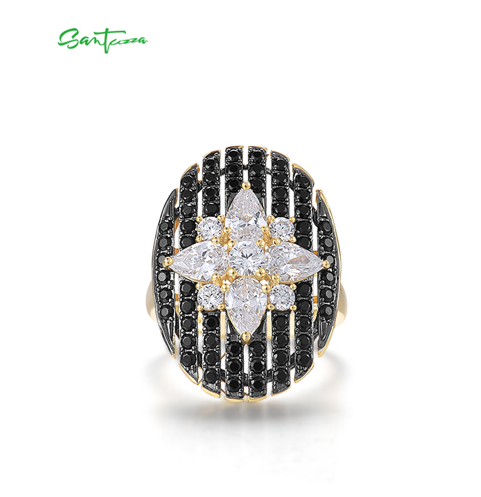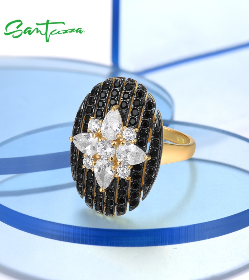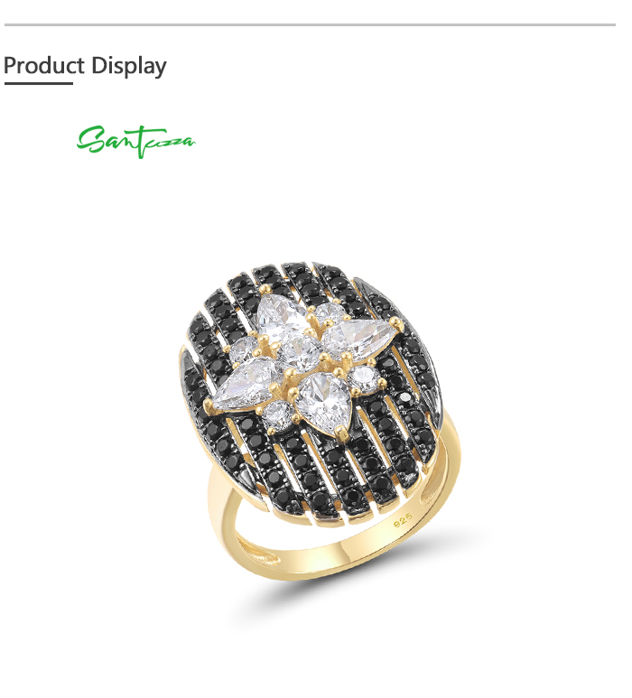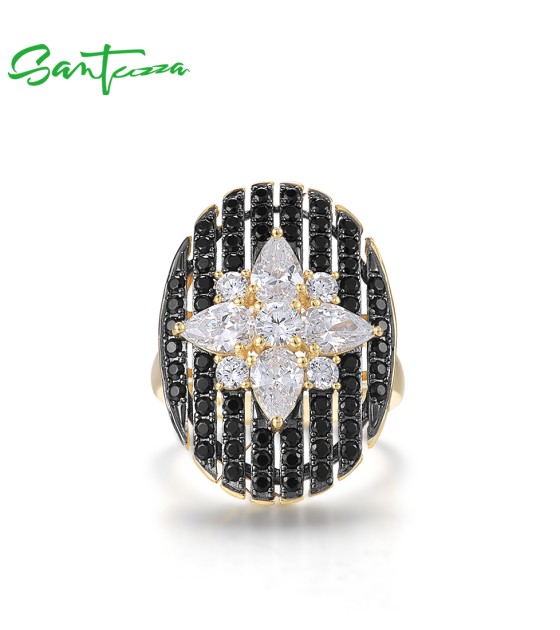SANTUZZA 925 Sterling Silver Rings Black Spinel White CZ Star Oval Ring Fine Jewelry