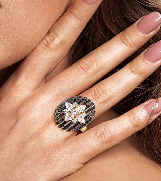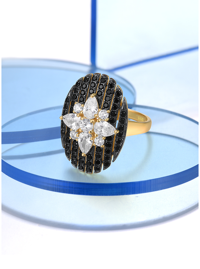SANTUZZA 925 Sterling Silver Rings Black Spinel White CZ Star Oval Ring Fine Jewelry - US 9