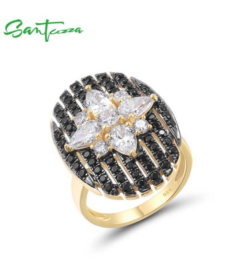 SANTUZZA 925 Sterling Silver Rings Black Spinel White CZ Star Oval Ring Fine Jewelry