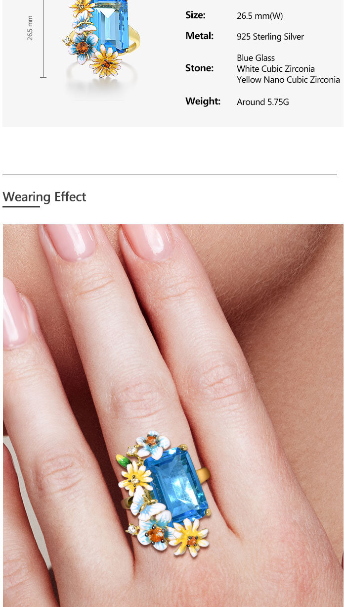 SANTUZZA 925 Sterling Silver Rings Gold Color Blue Stone Enamel Flowers Butterfly Fine Jewelry - US 10