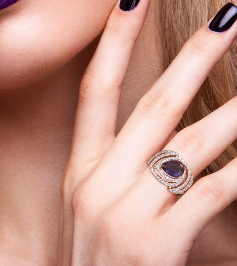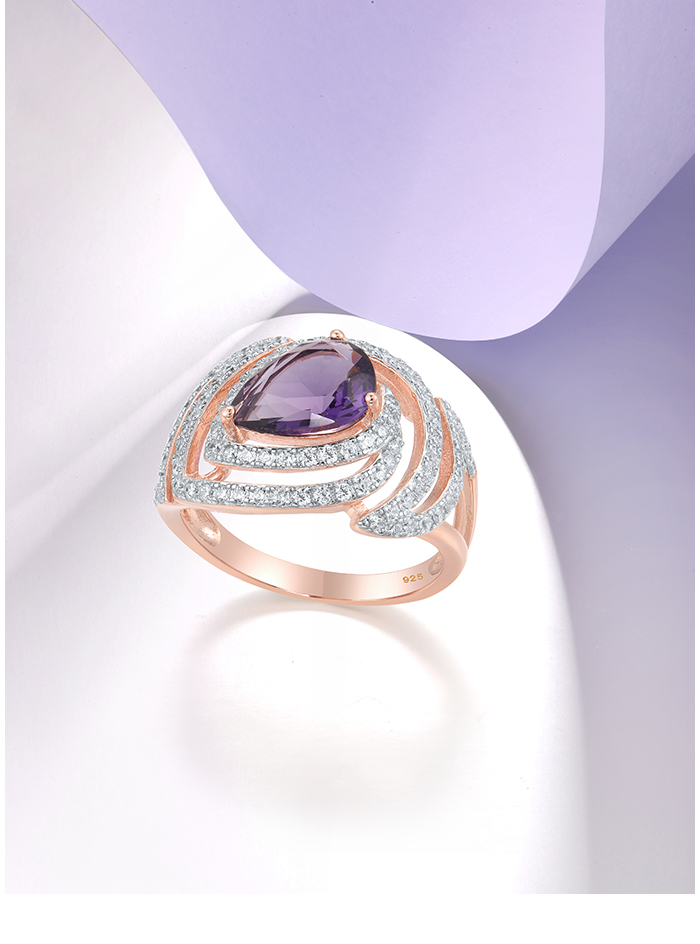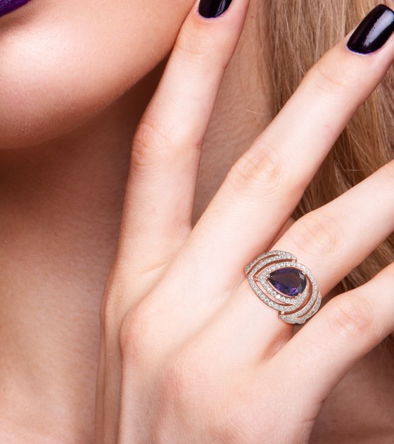 SANTUZZA 925 Sterling Silver Rings Pear Purple Stone White CZ Ring Fine Jewelry - US 7