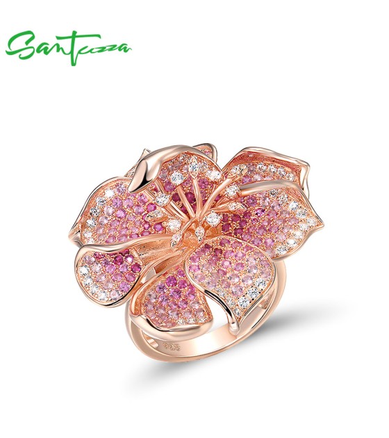 SANTUZZA 925 Sterling Silver Ring Created Ruby Pink Sapphire Flower Blossom Jewelry