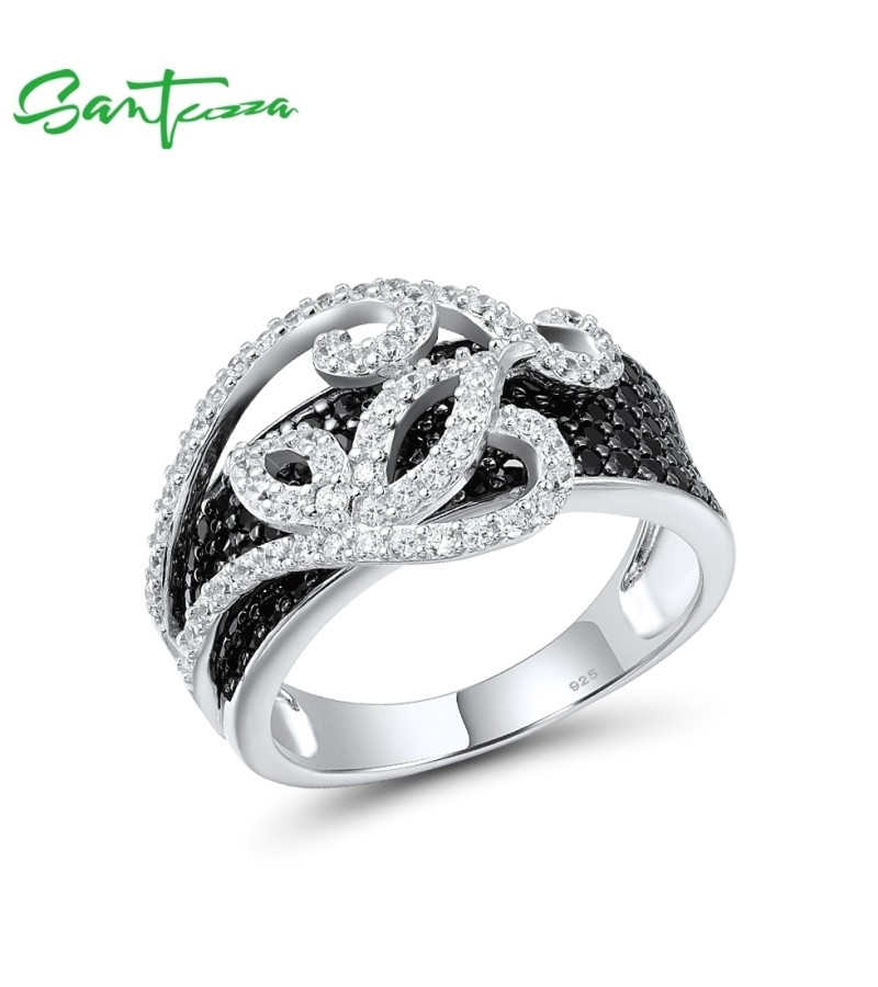 SANTUZZA 925 Sterling Silver Rings Black Spinel White Cubic Zirconia Jewelry
