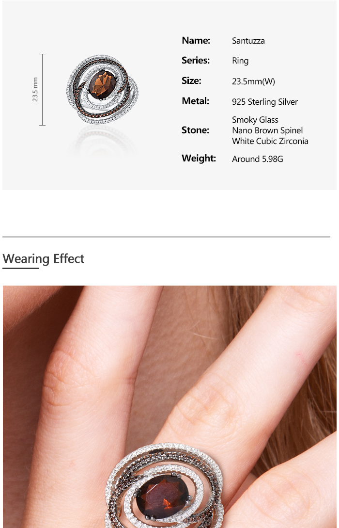 SANTUZZA Silver Ring 925 Sterling Silver Brown Smoky Glass Round Jewelry - US 7