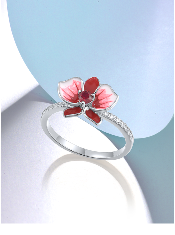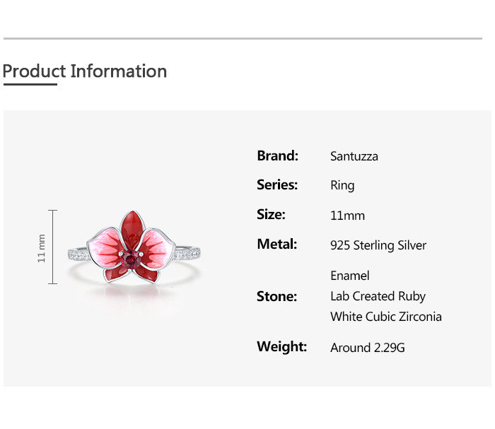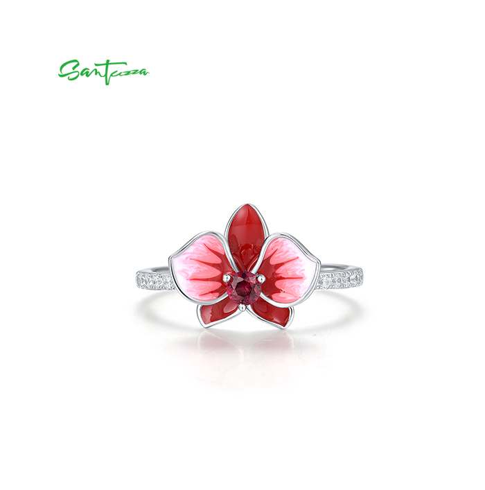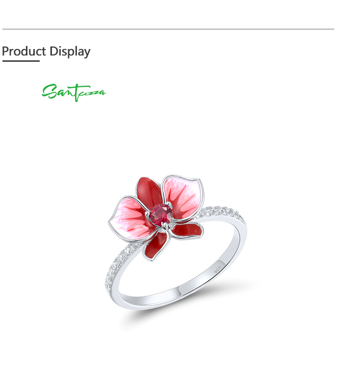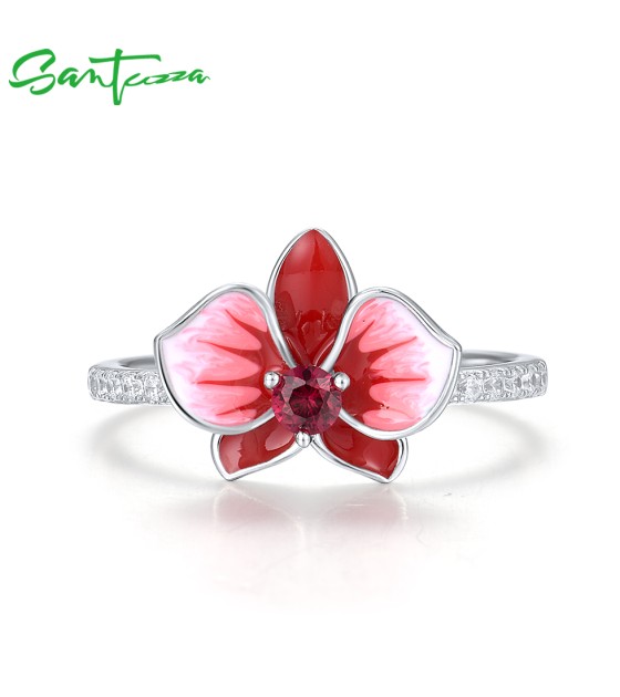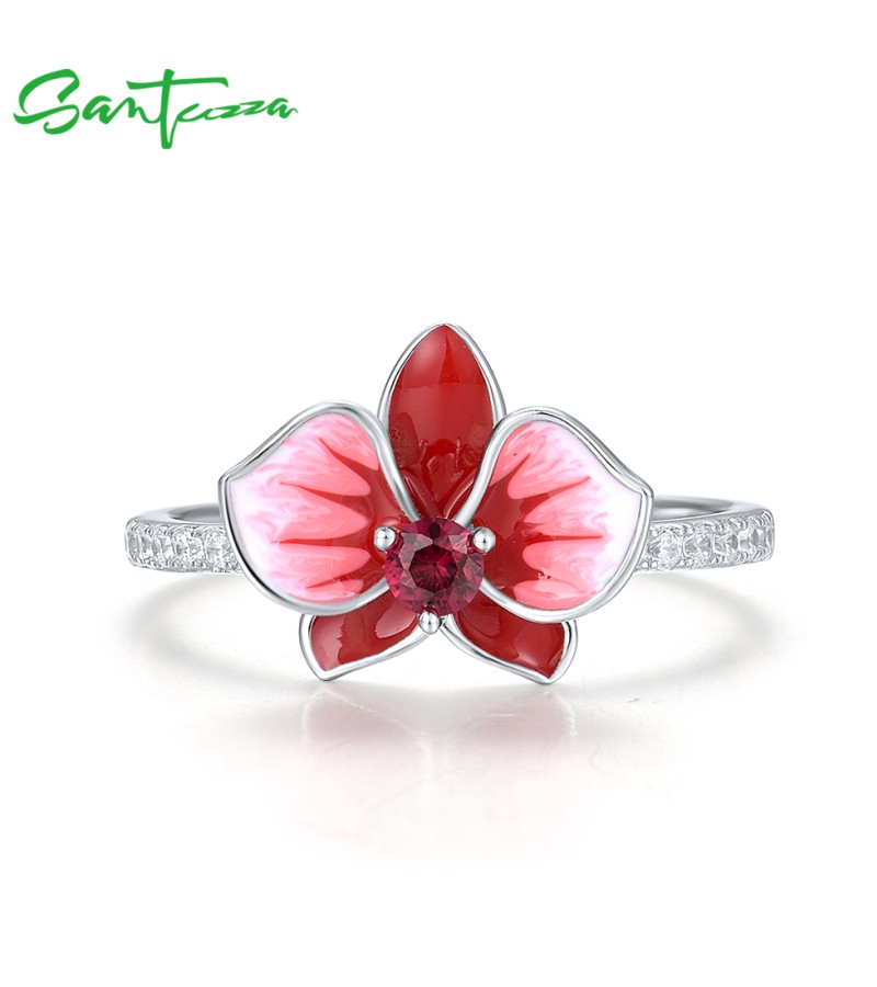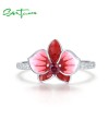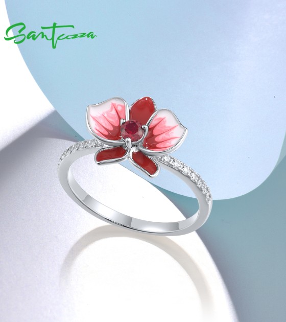 SANTUZZA 925 Sterling Silver Rings White CZ Created Ruby Flower Enamel Jewelry