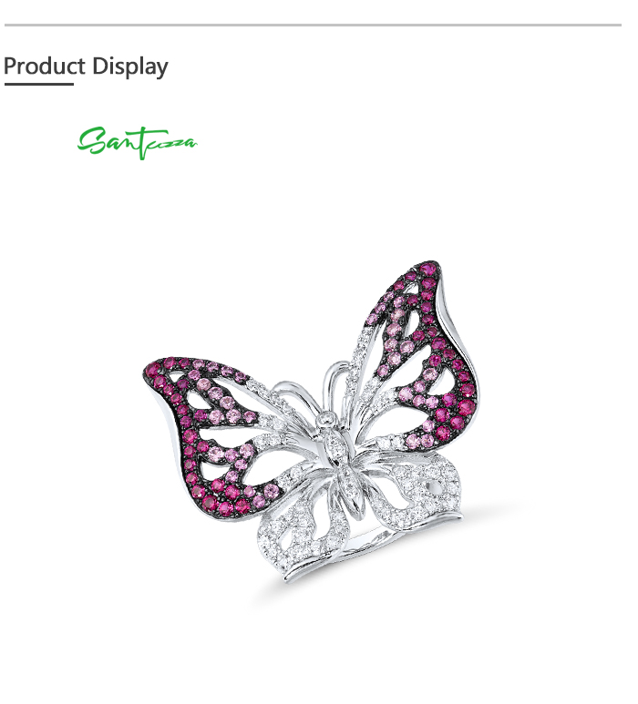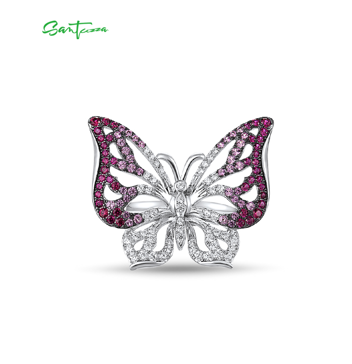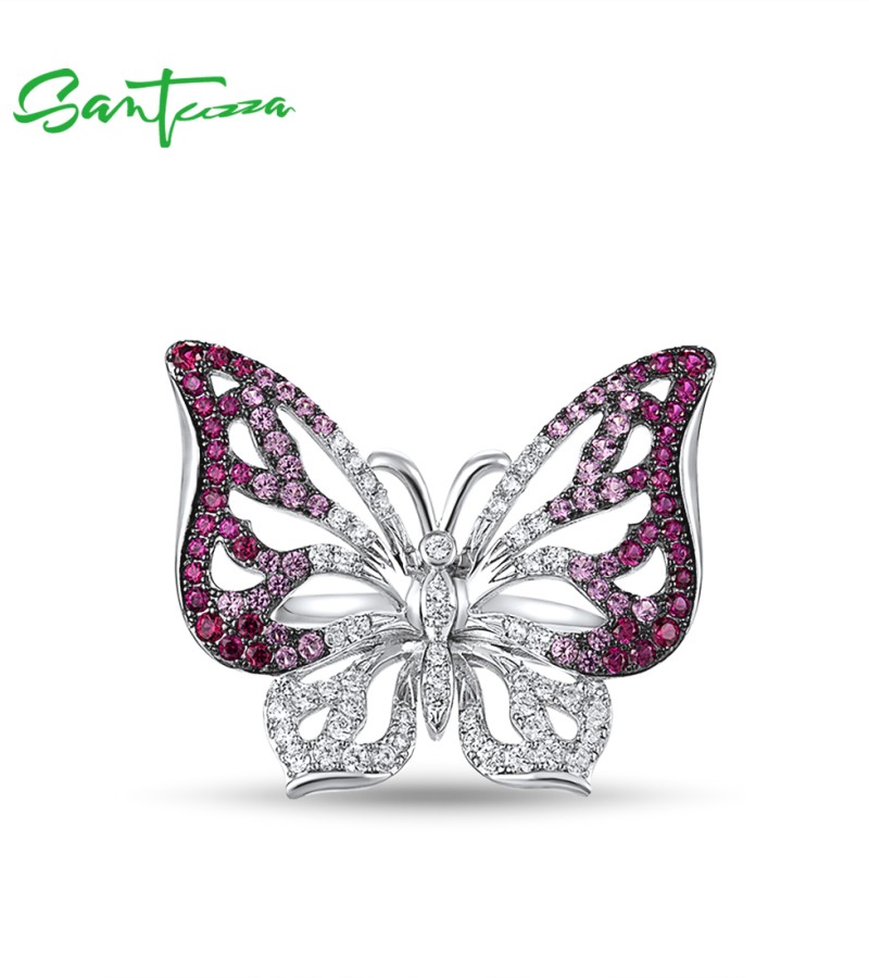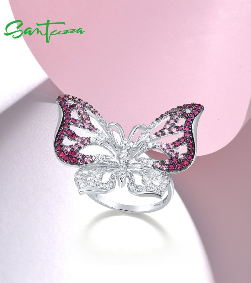 SANTUZZA Silver Ring Genuine 925 Sterling Silver Red Stones White CZ Butterfly Ring Jewelry