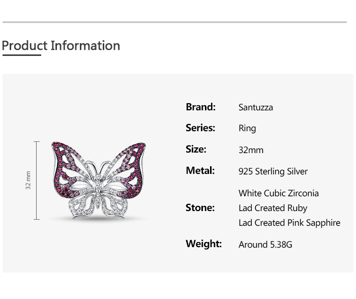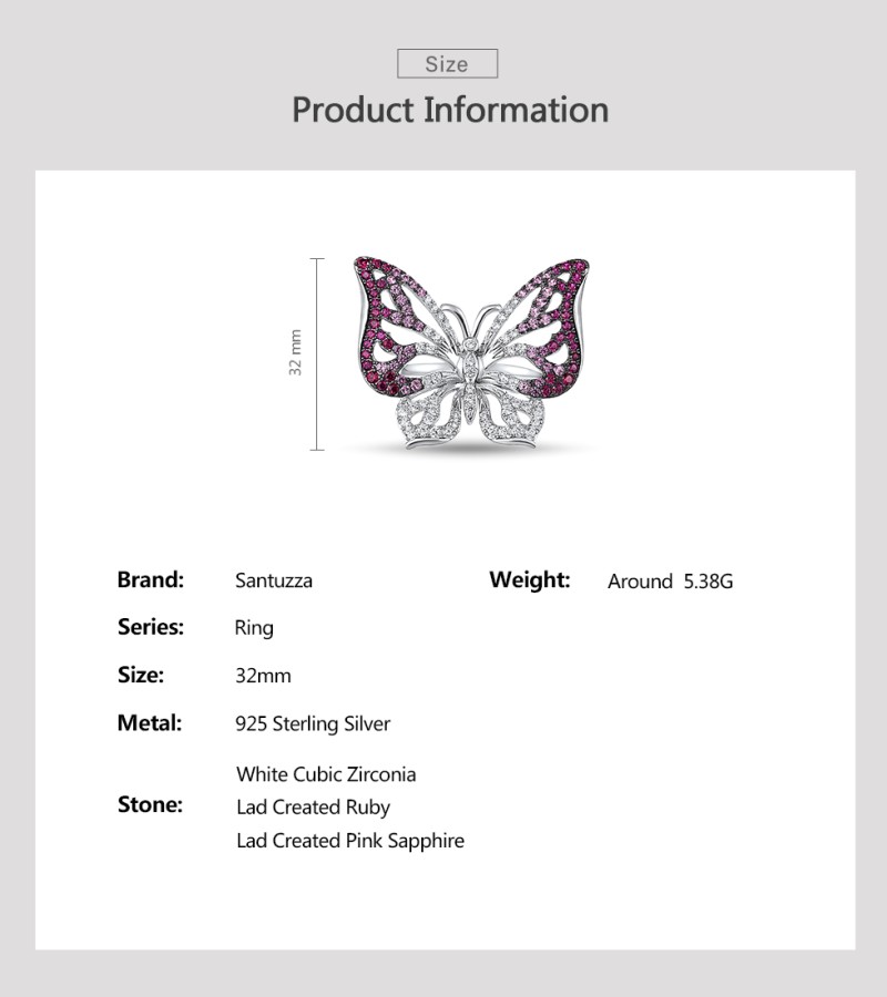 SANTUZZA Silver Ring Genuine 925 Sterling Silver Red Stones White CZ Butterfly Ring Jewelry - US 8
