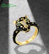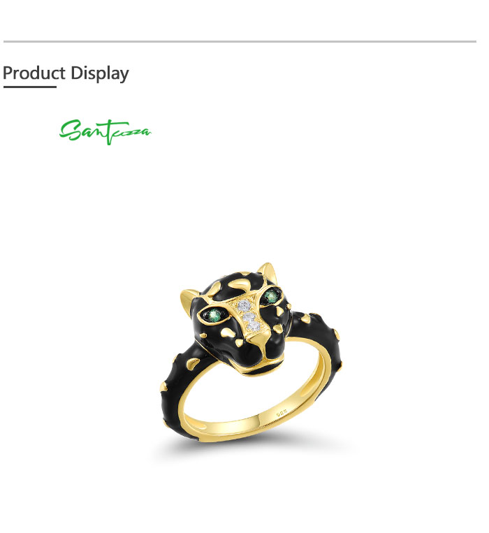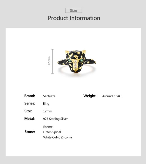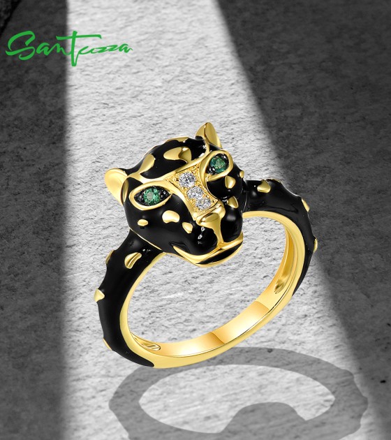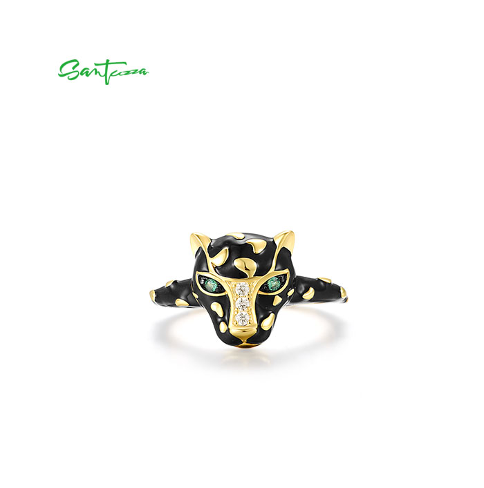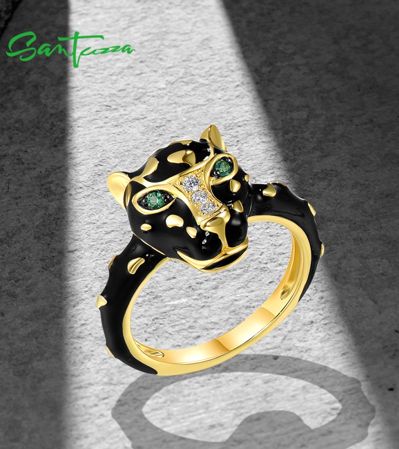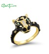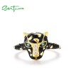 SANTUZZA 925 Sterling Silver Black Leopard Ring Green Spinel White CZ Animal Jewelry Enamel