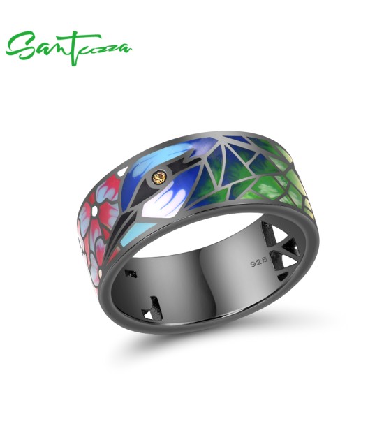 SANTUZZA 925 Sterling Silver Rings Yellow Nano CZ Bird Enamel Rings Black Color Jewelry Handmade