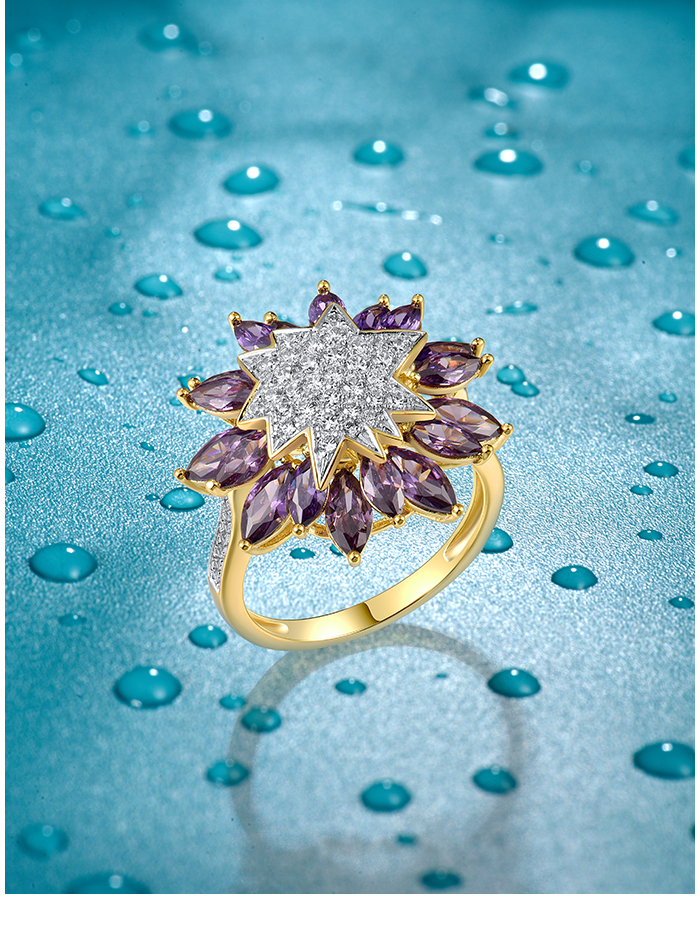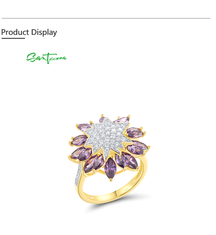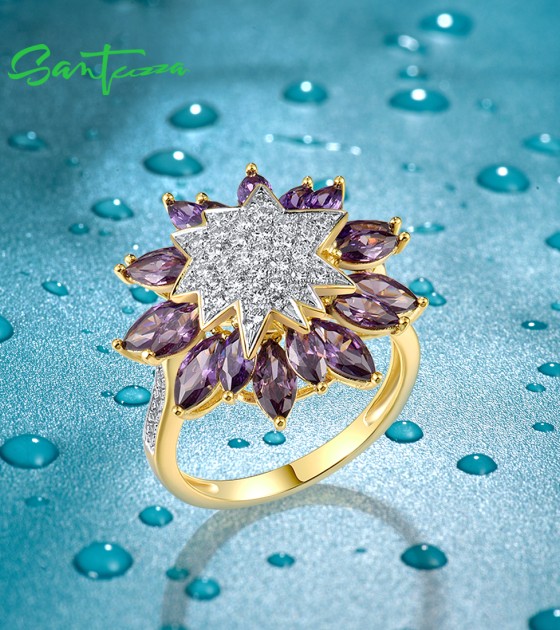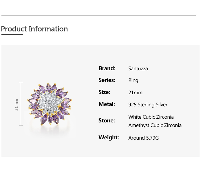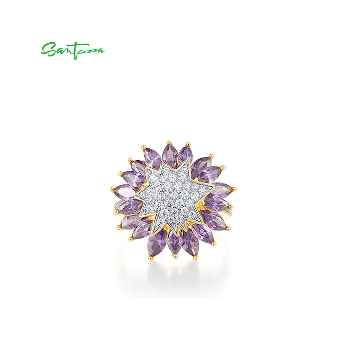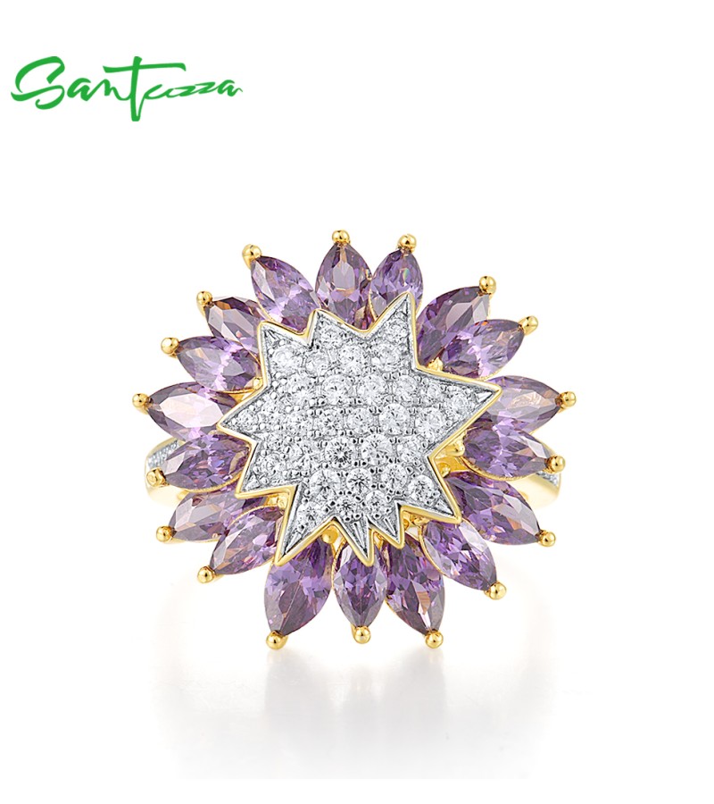 SANTUZZA 925 Sterling Silver Ring Purple Sunflower White Cubic Zirconia Jewelry