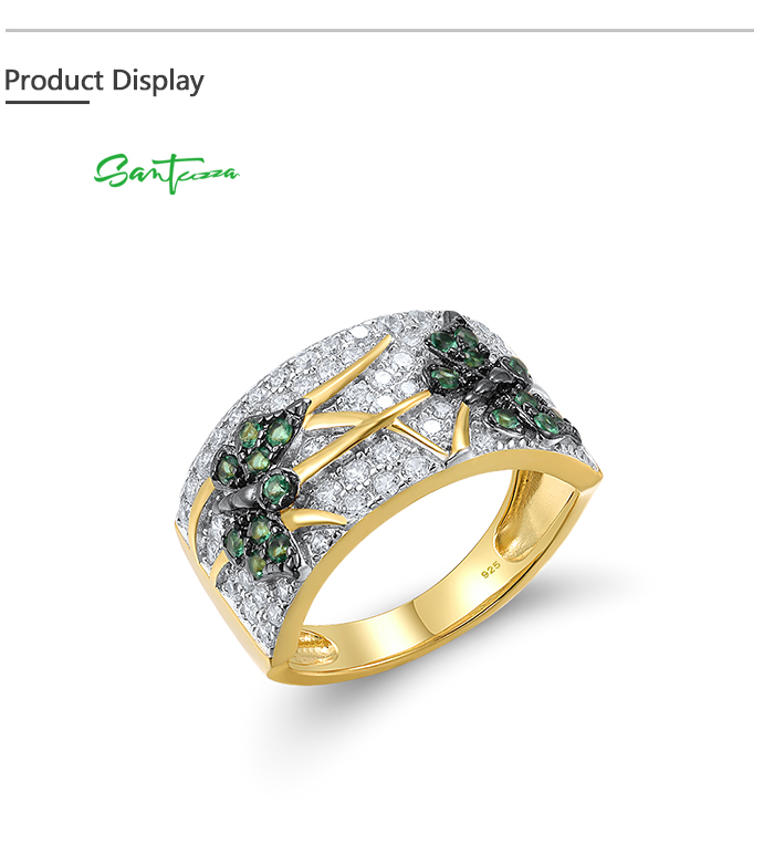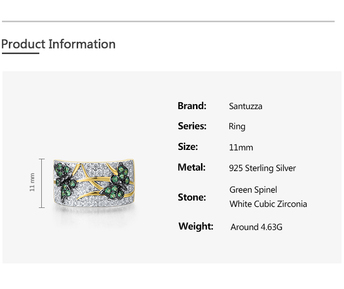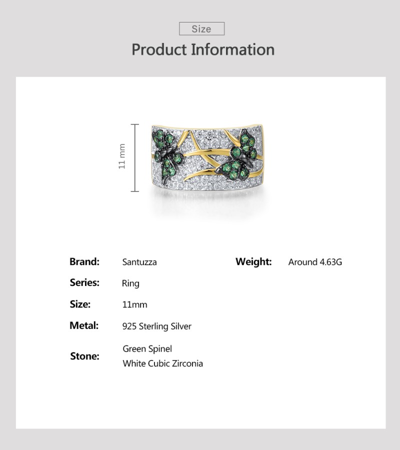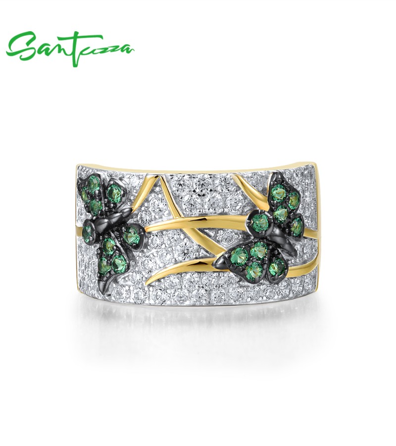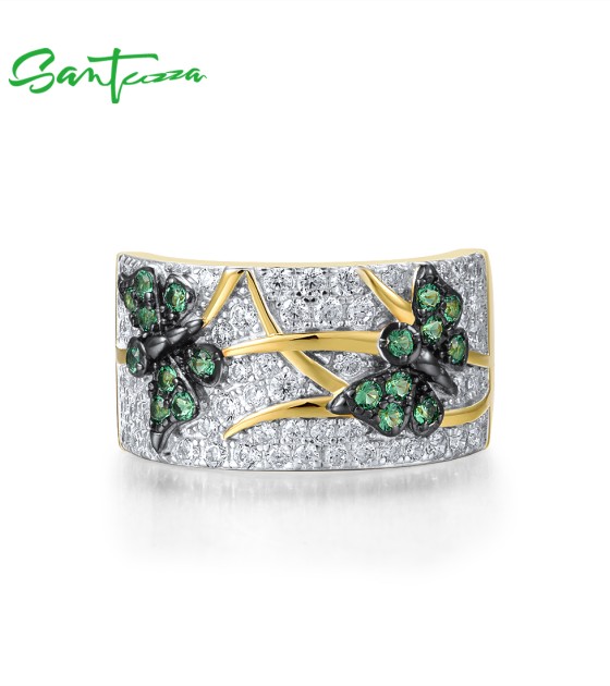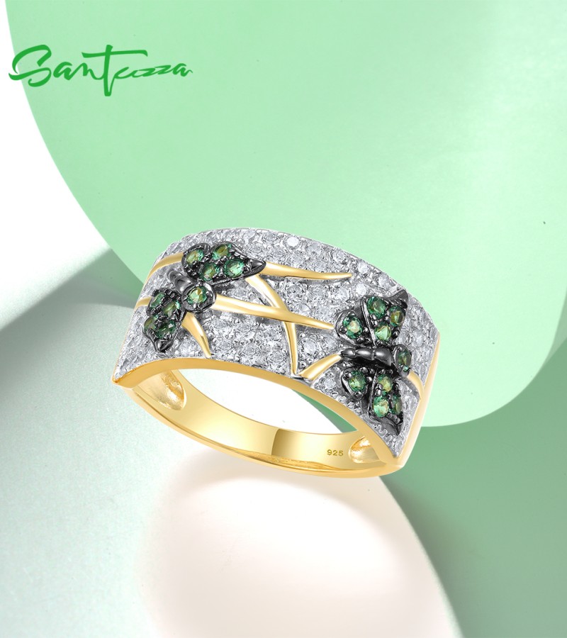 SANTUZZA 925 Sterling Silver Rings Round Green Spinel Butterfly Animal Gold Plated Jewelry