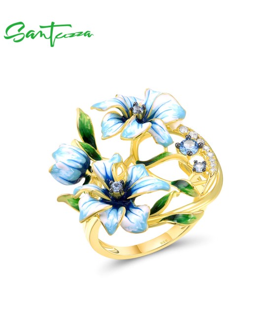 SANTUZZA 925 Sterling Silver Rings Blue Spinel White CZ Handmade Enamel Flower Ring Jewelry