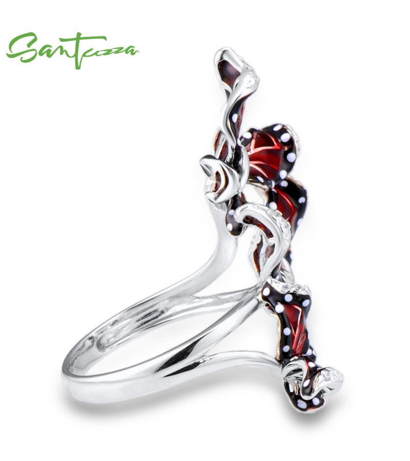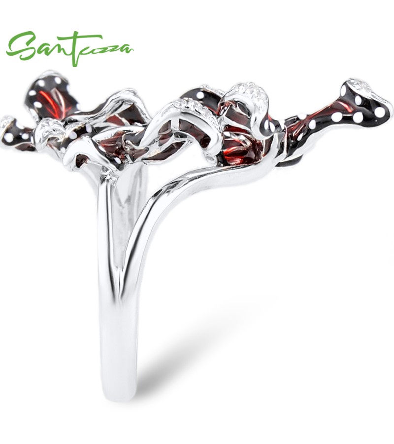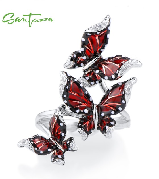 SANTUZZA 925 Sterling Silver Ring Handmade Enamel Red Butterflies Fine Jewelry