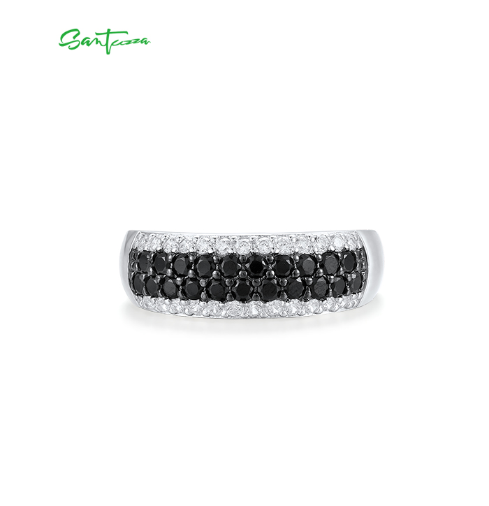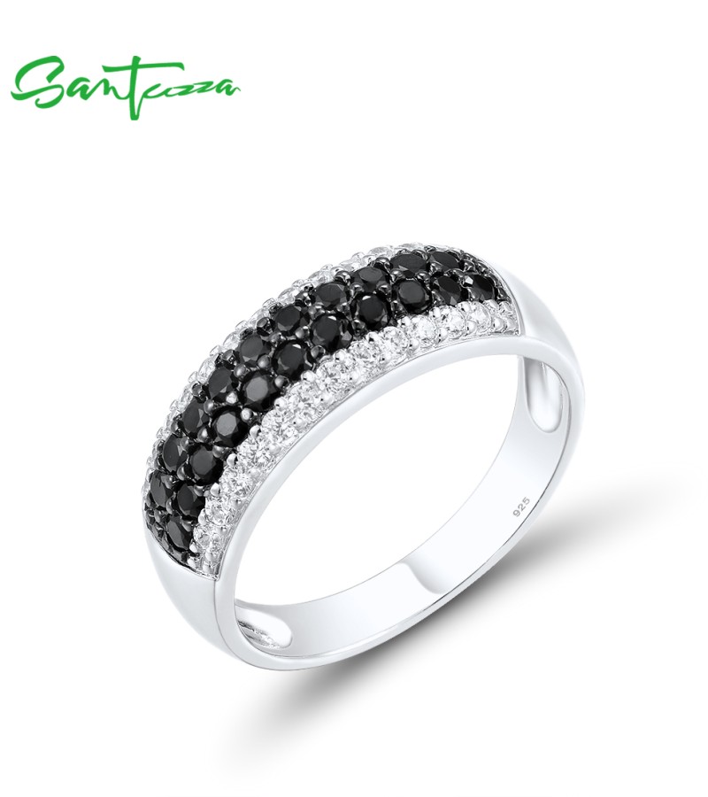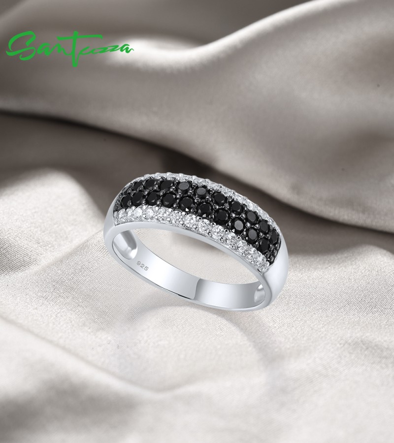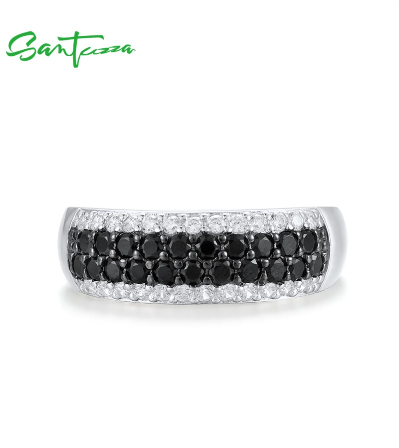 SANTUZZA 925 Sterling Silver Rings Black Spinel White Cubic Zirconia Band Ring Jewelry