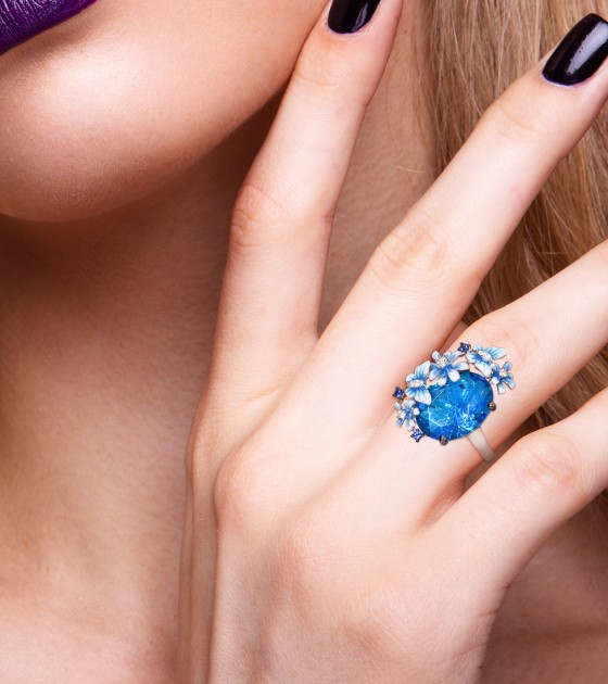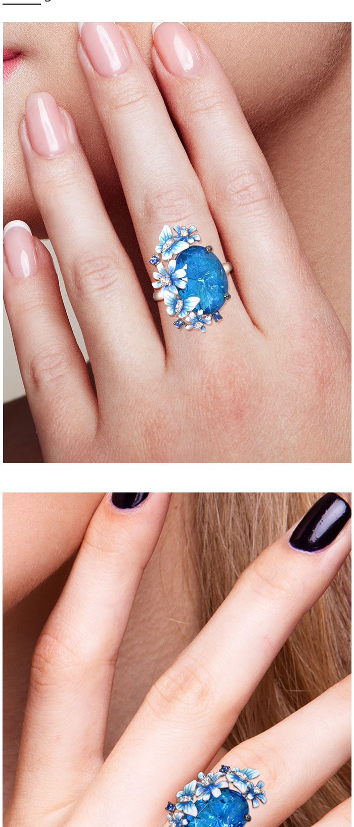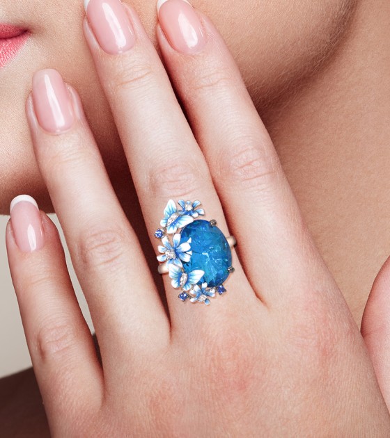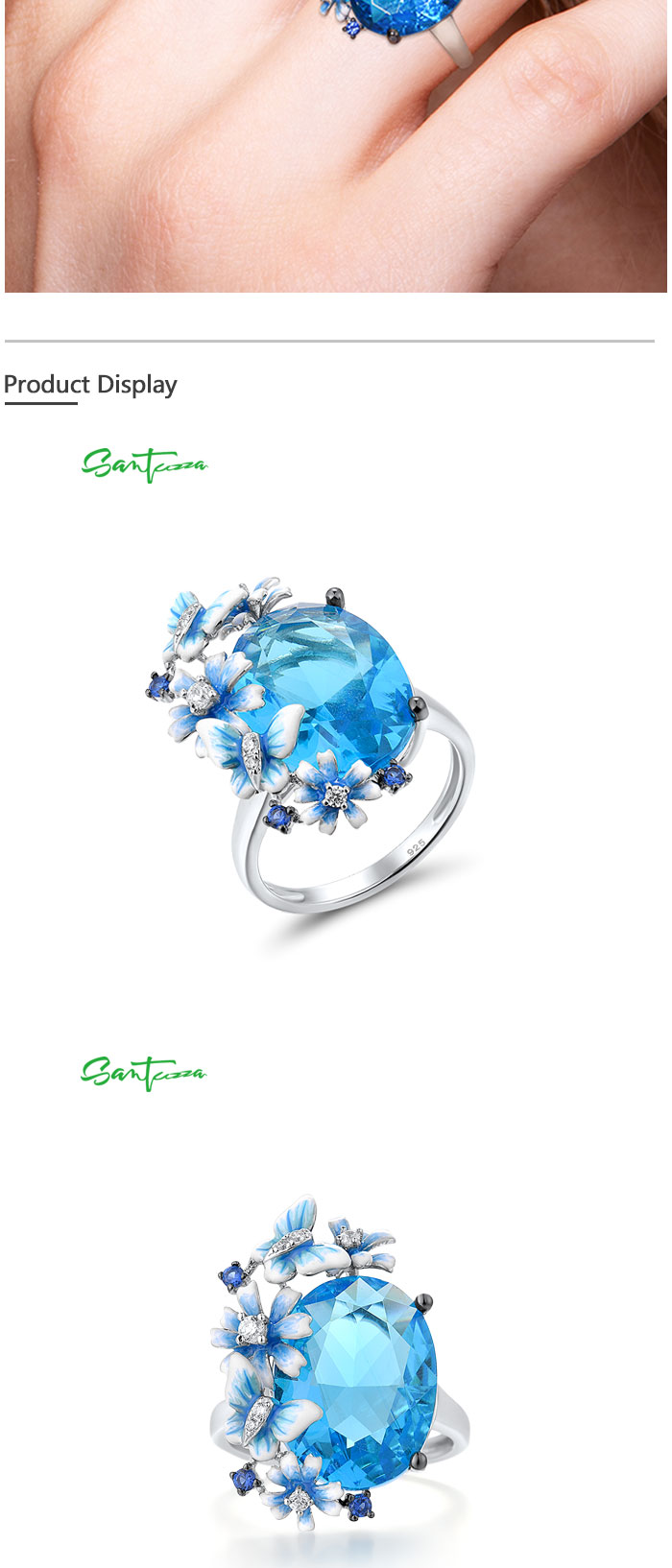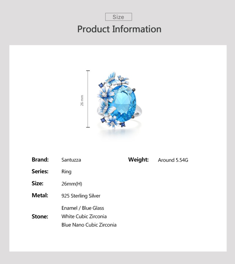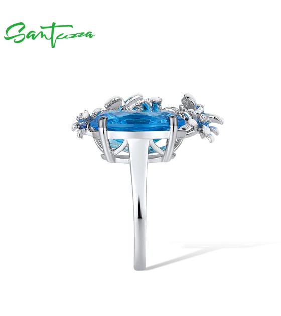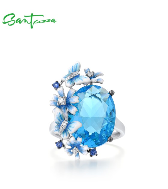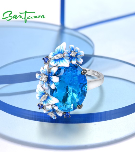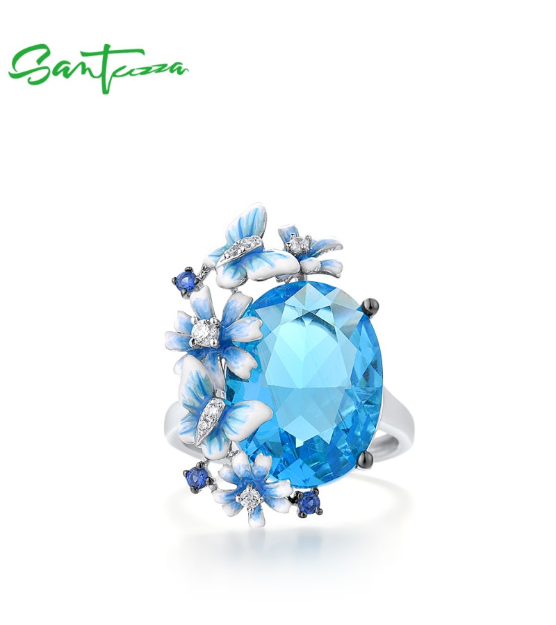SANTUZZA 925 Sterling Silver Rings Shiny Oval Blue Stone Enamel Flowers Butterfly Ring Jewelry
