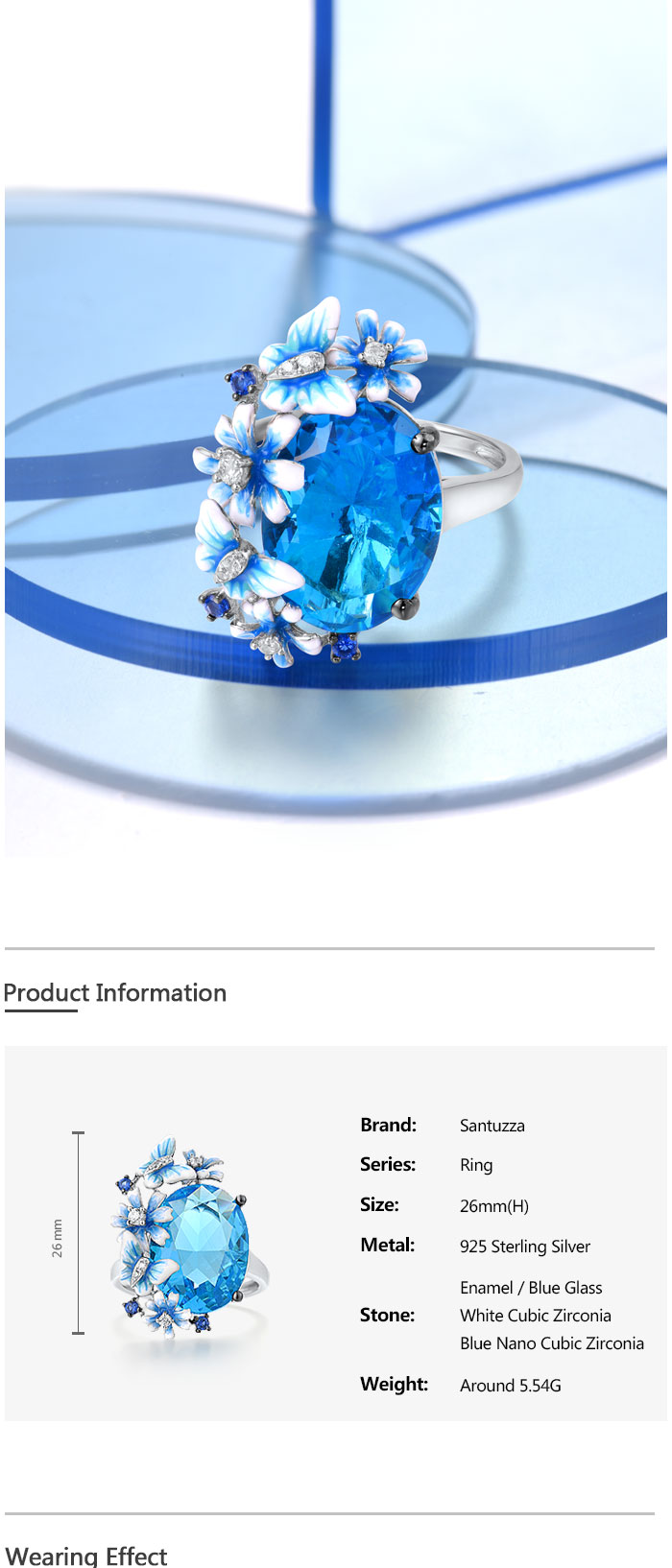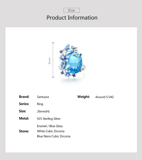 SANTUZZA 925 Sterling Silver Rings Shiny Oval Blue Stone Enamel Flowers Butterfly Ring Jewelry - US 9