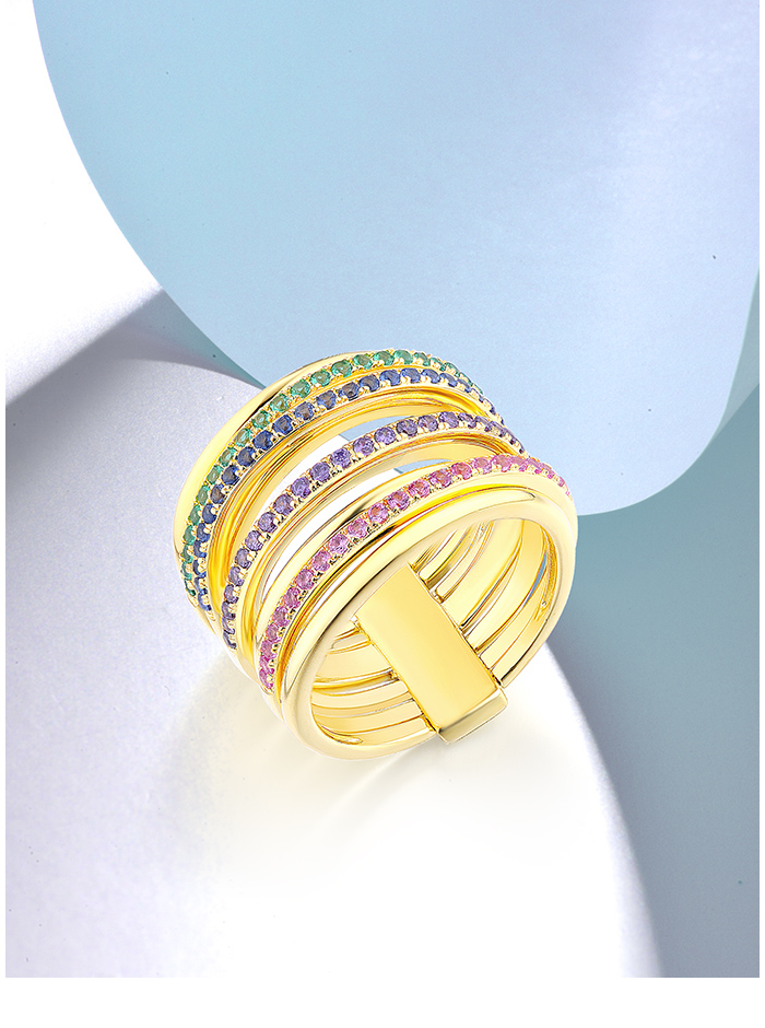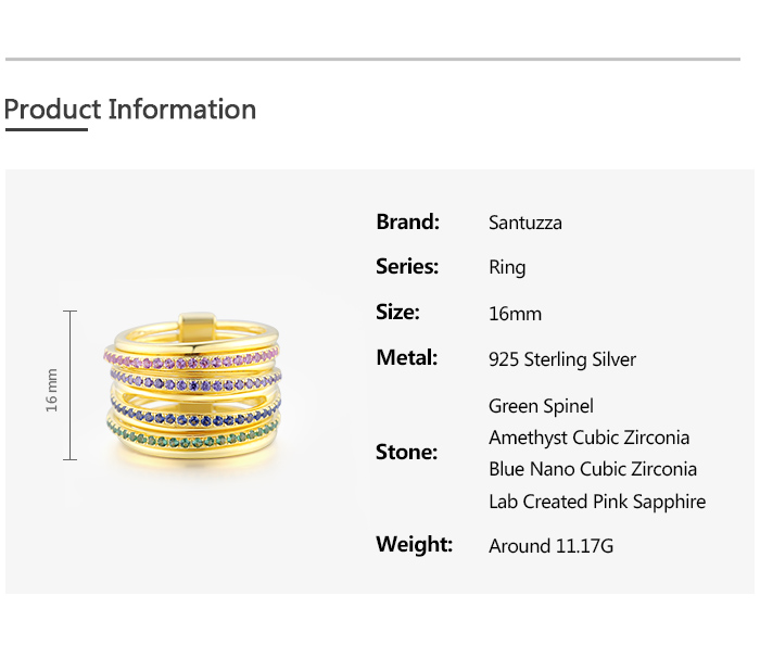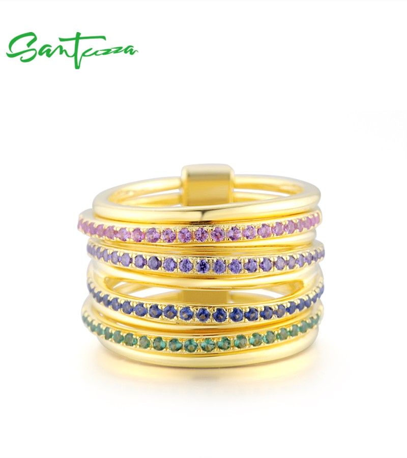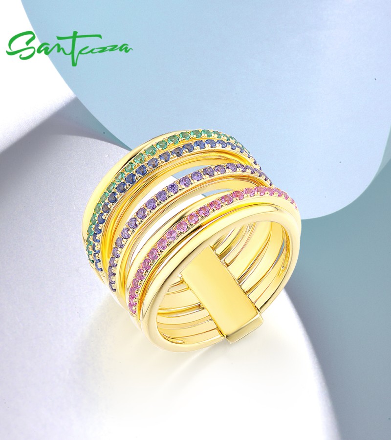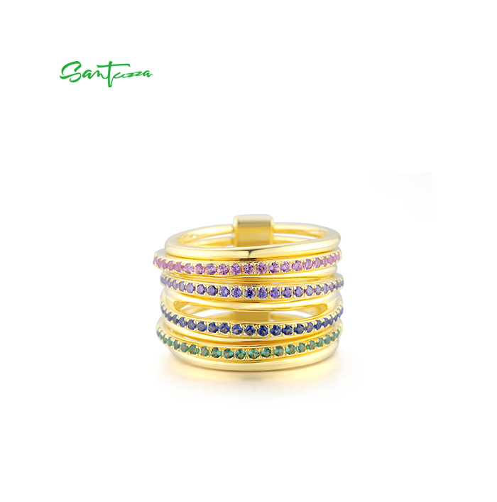 SANTUZZA 925 Sterling Silver Layer Ring Colorful Gemstone Yellow Gold Plated Jewelry