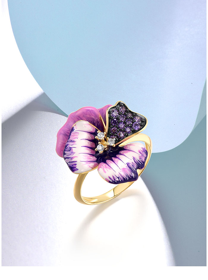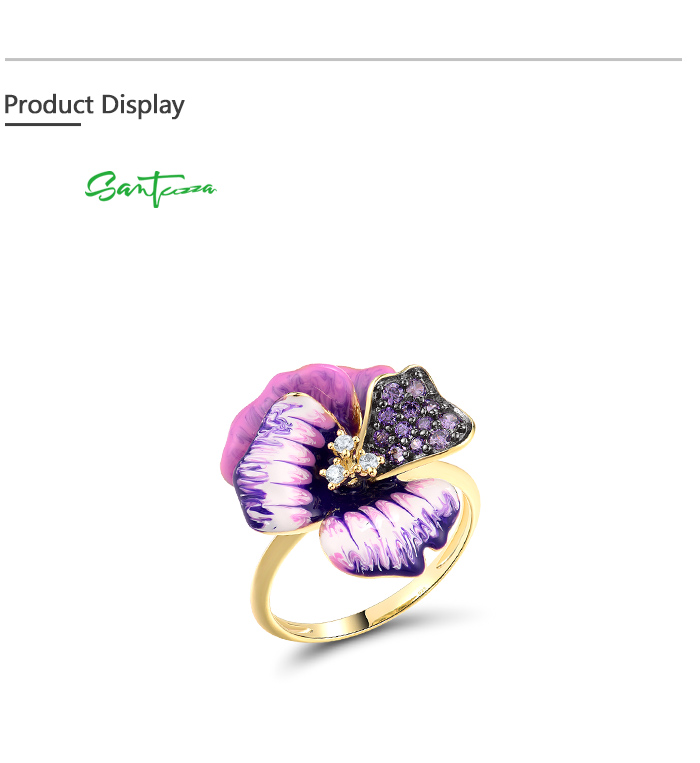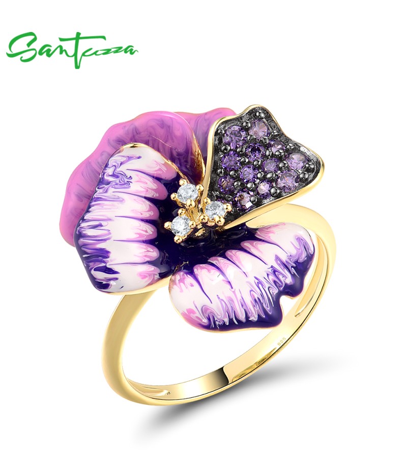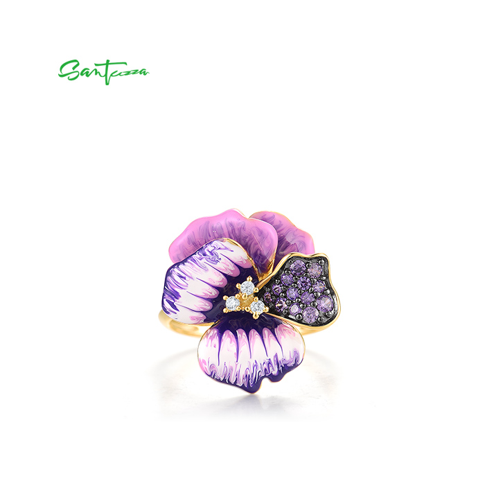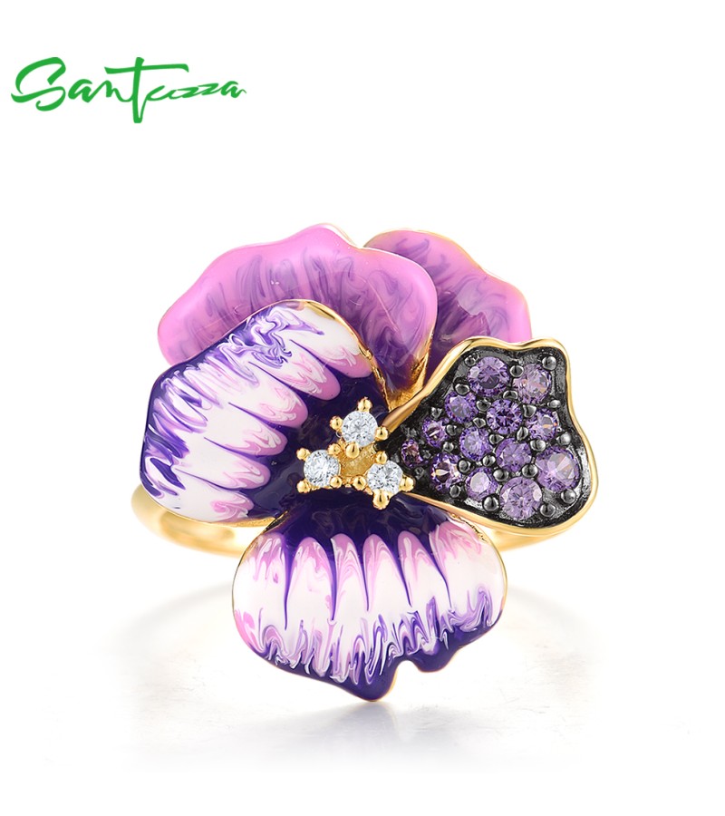 SANTUZZA 925 Sterling Silver Ring Amethyst Cubic Zirconia Enamel Flower Jewelry