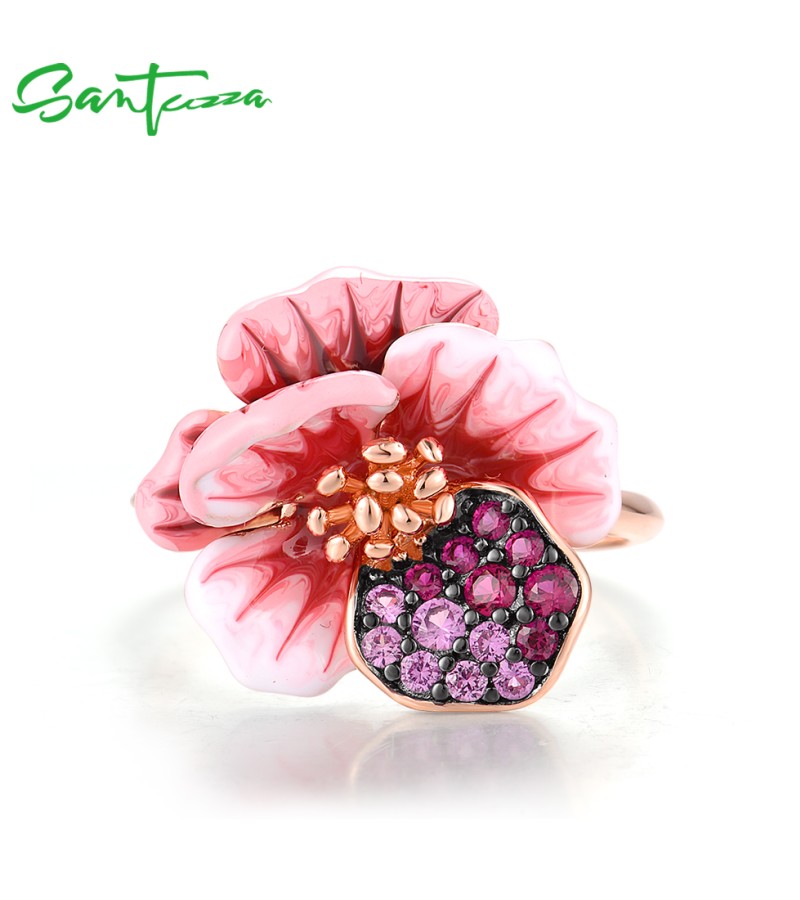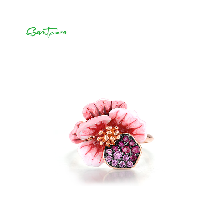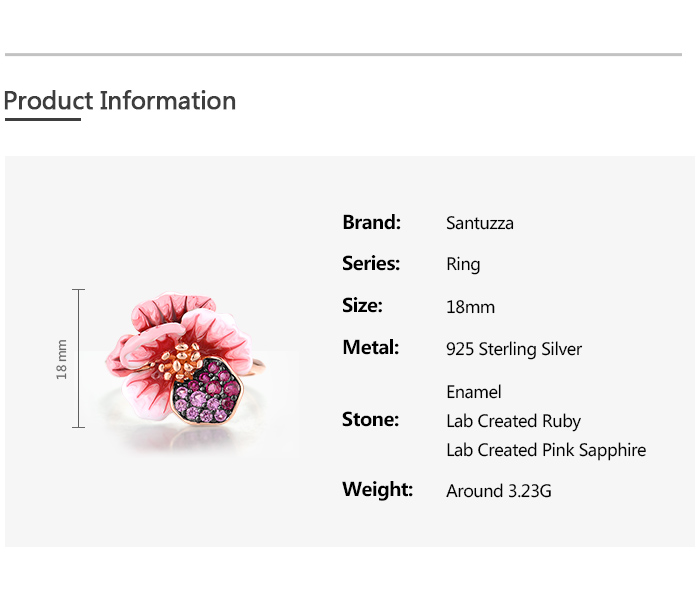 SANTUZZA 925 Sterling Silver Pendant Created Pink Red Sapphire Enamel Flower Jewelry
