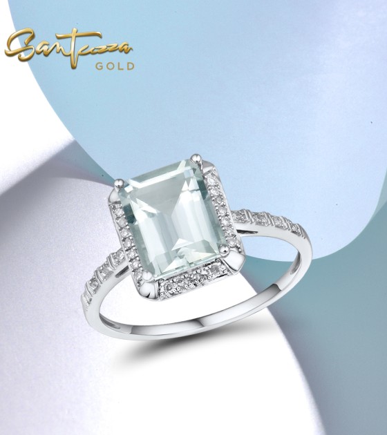 SANTUZZA 14K 585 White Gold Ring Diamond Rectangle Green Amethyst (Prasiolite ) Fine Jewelry