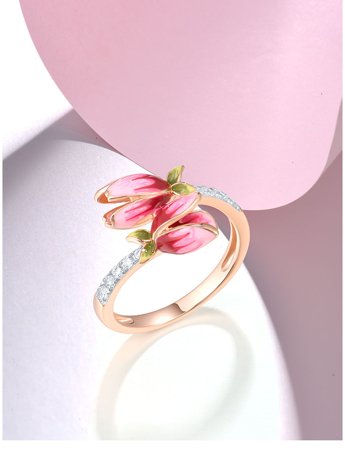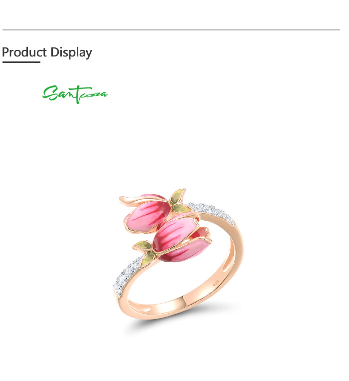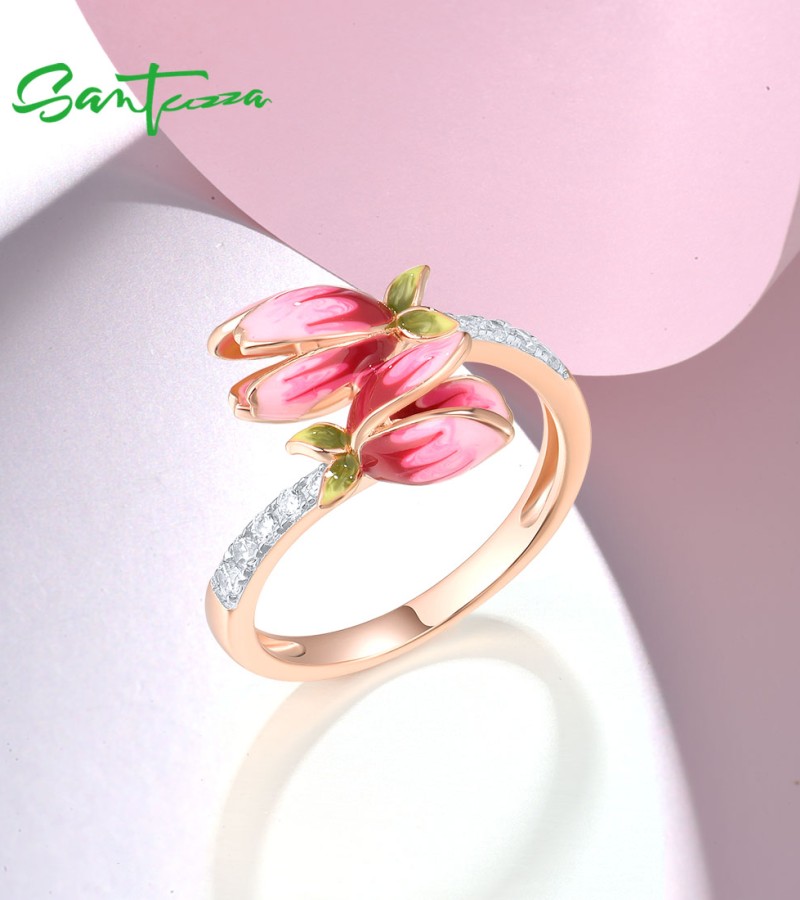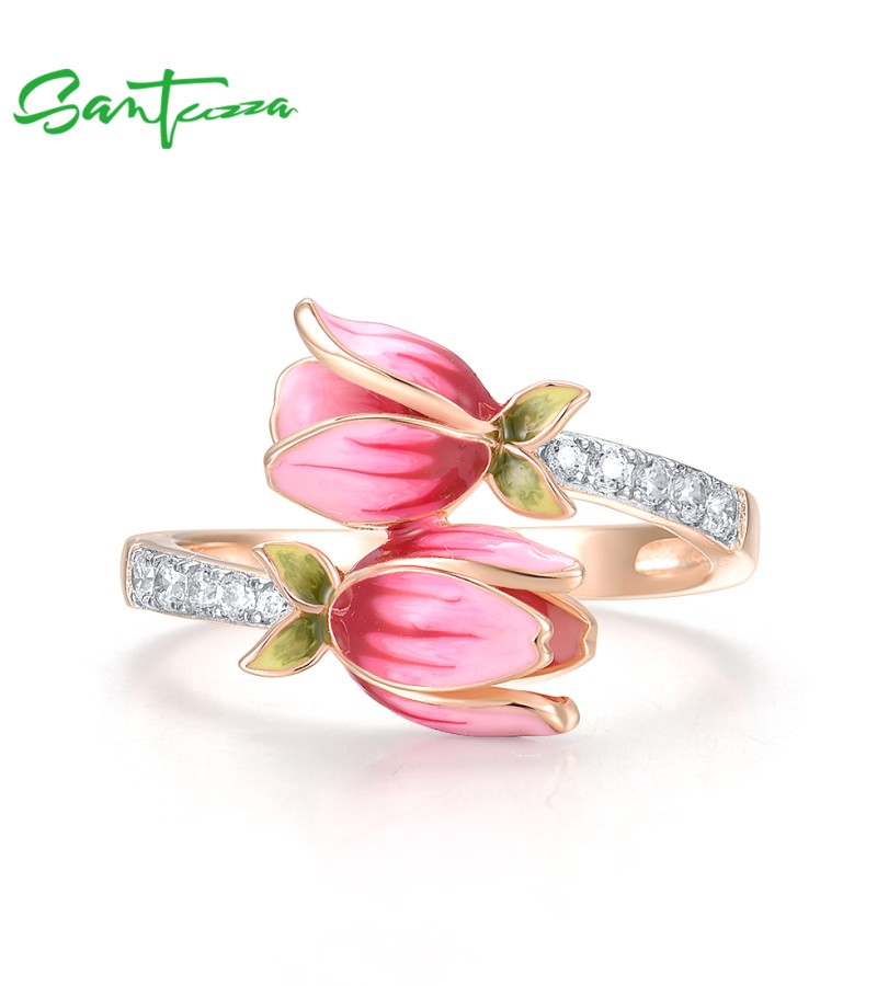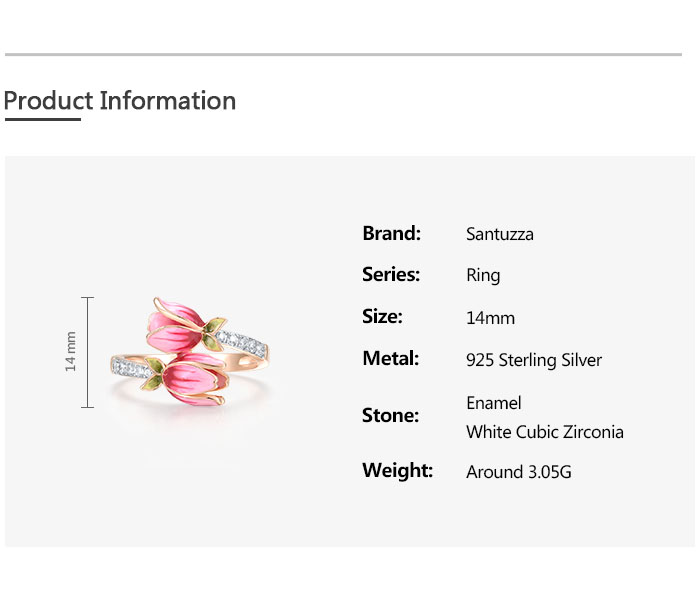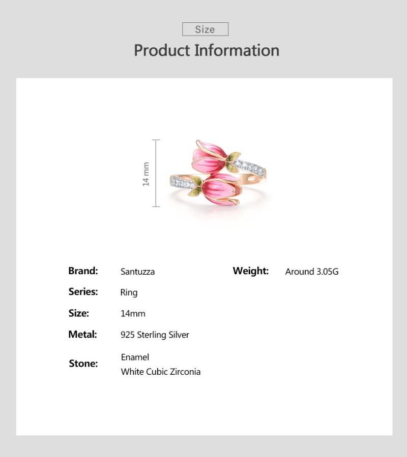 SANTUZZA 925 Sterling Silver Rings White Cubic Zirconia Enamel Tulip Flower Jewelry