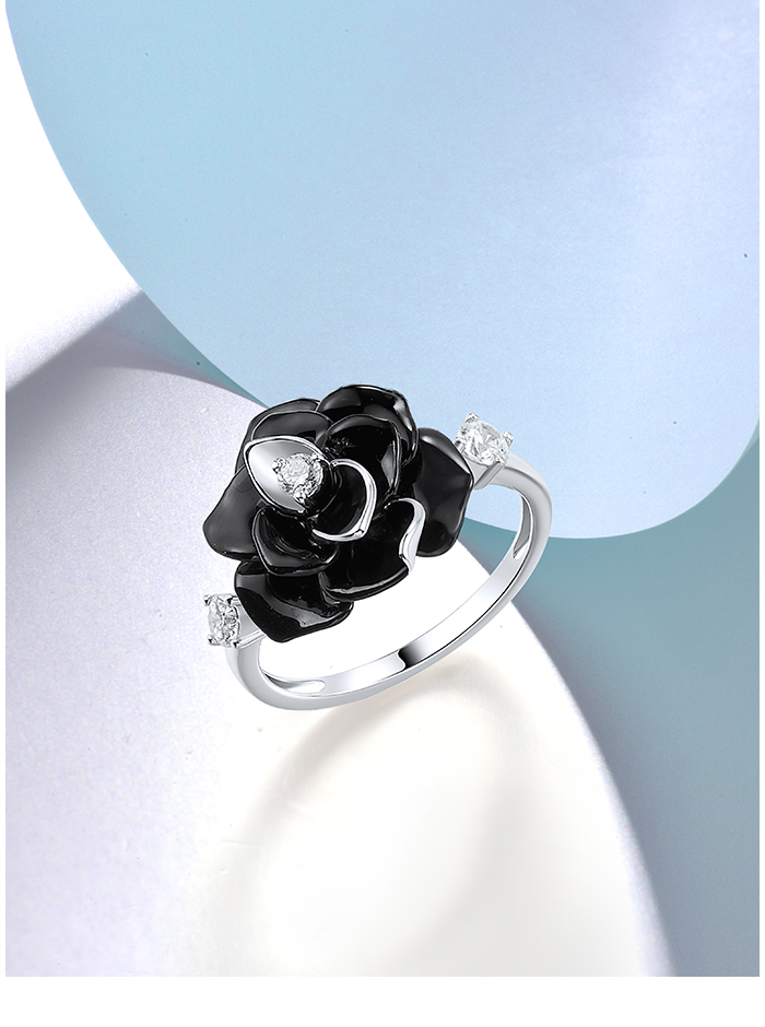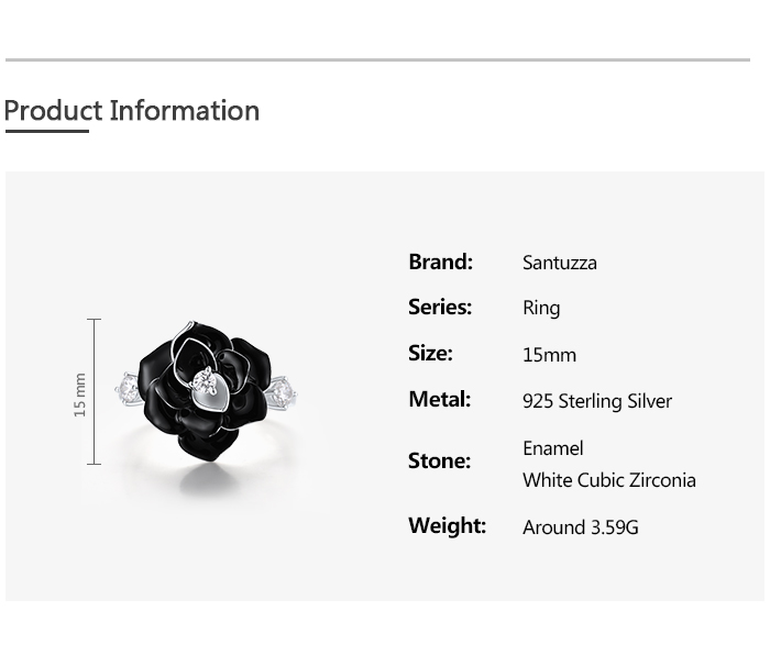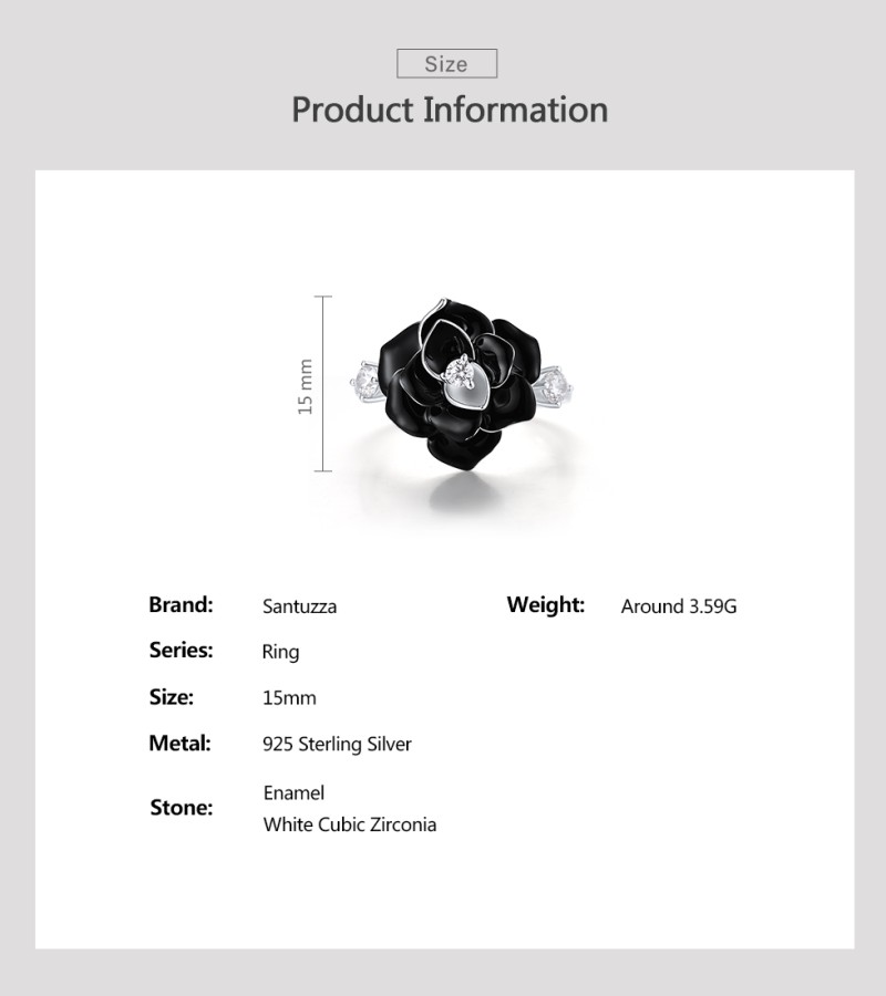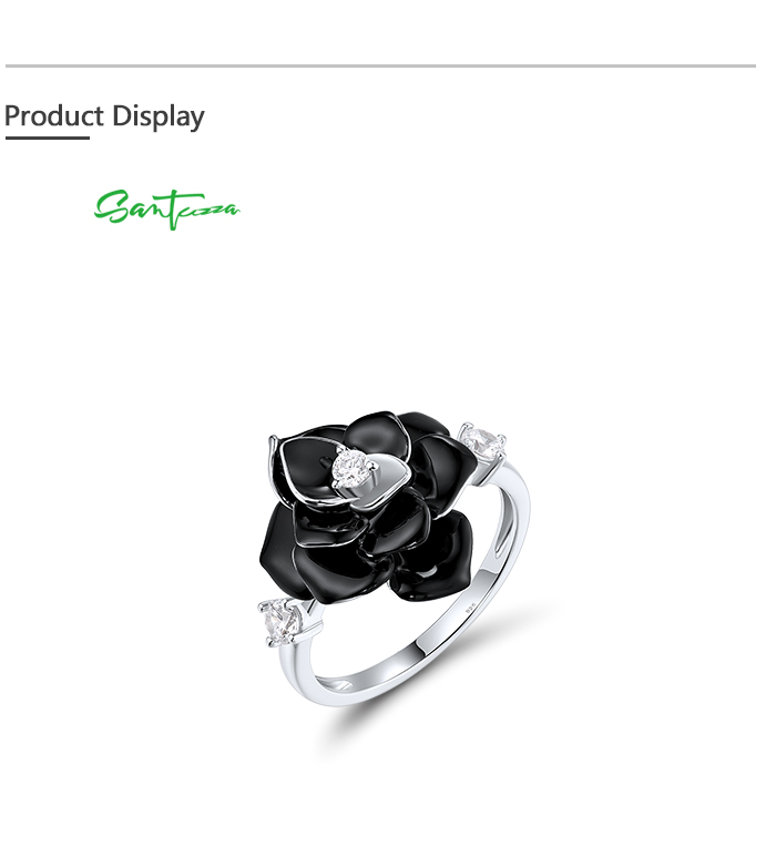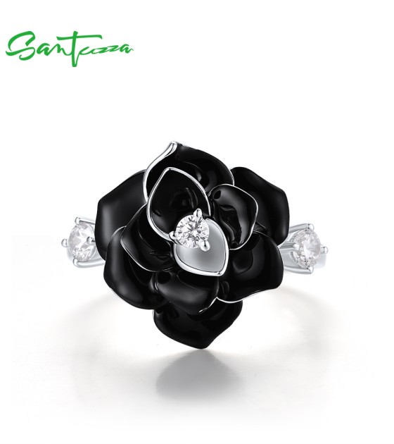 SANTUZZA 925 Sterling Silver Ring White CZ Black Flower Retro Style Enamel Jewelry