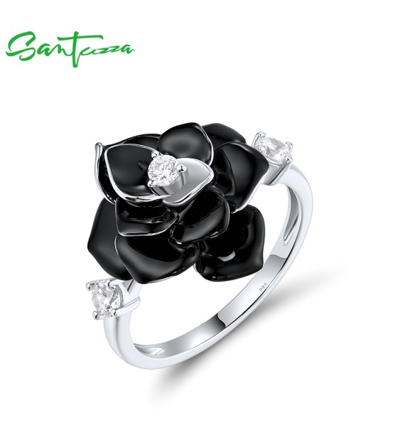 SANTUZZA 925 Sterling Silver Ring White CZ Black Flower Retro Style Enamel Jewelry