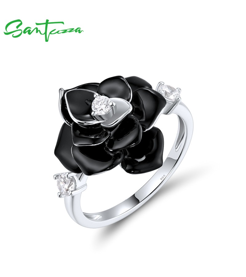 SANTUZZA 925 Sterling Silver Ring White CZ Black Flower Retro Style Enamel Jewelry - US 7