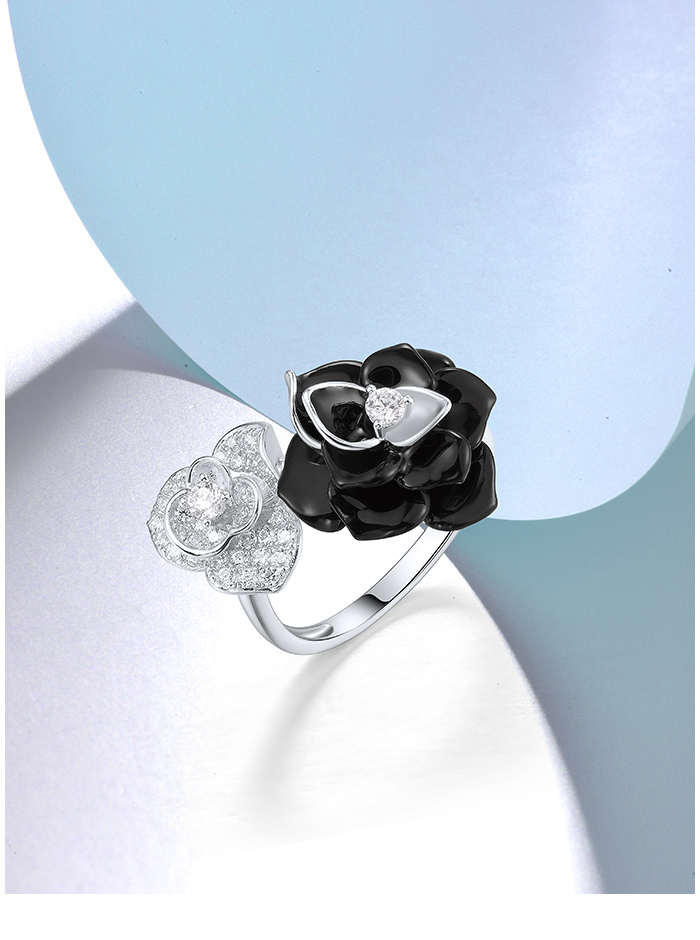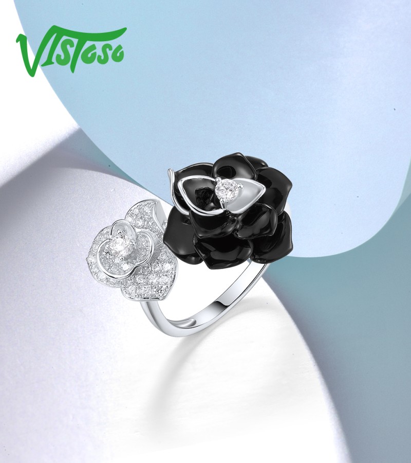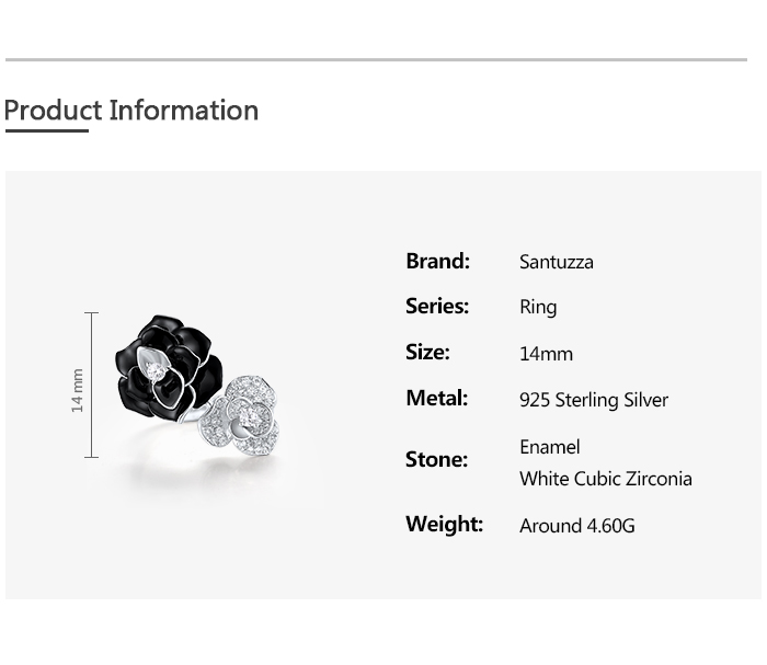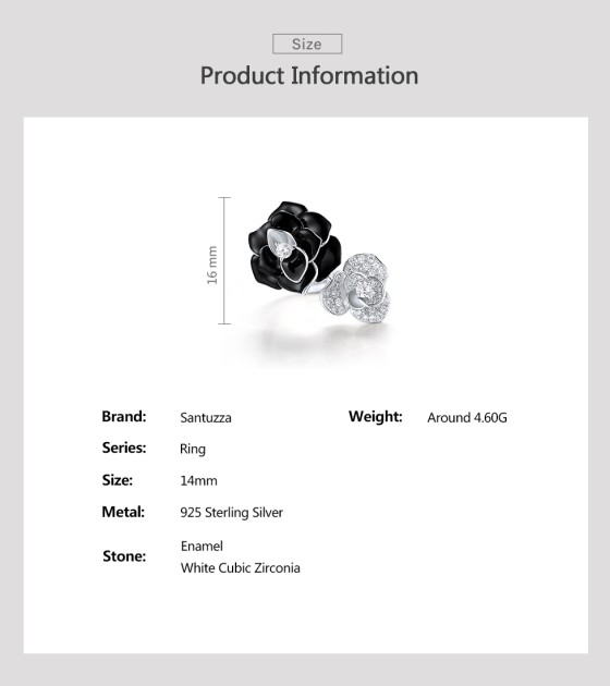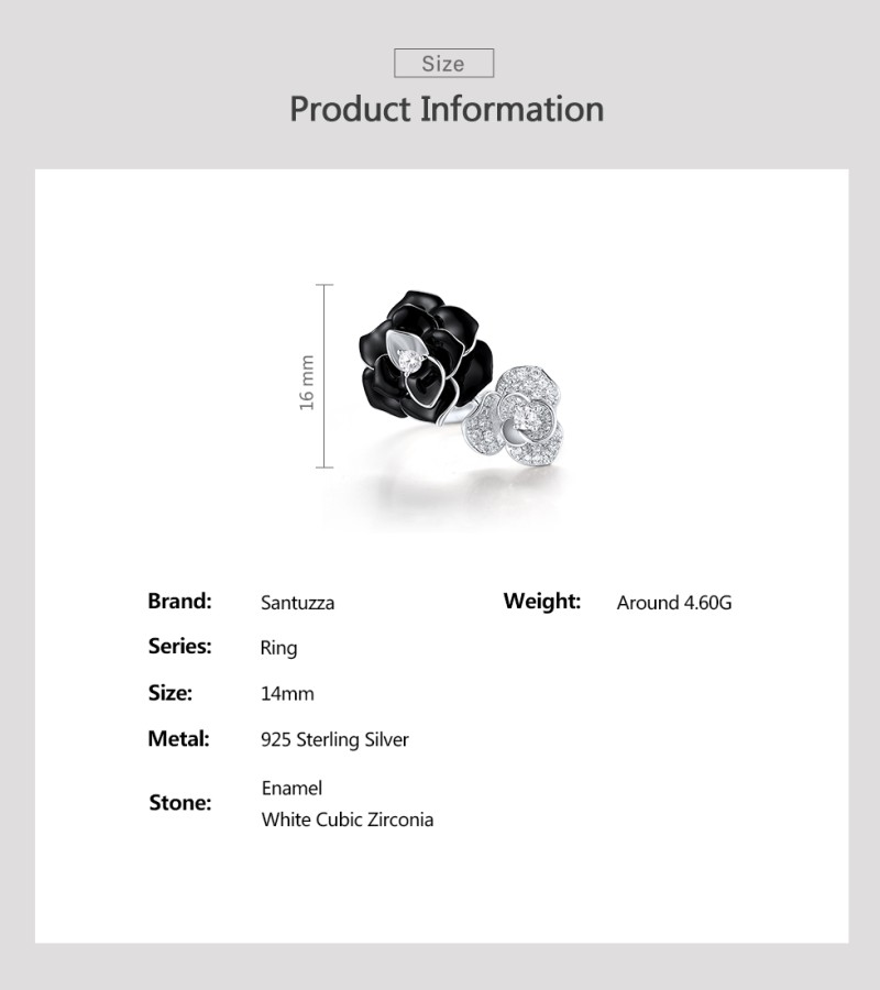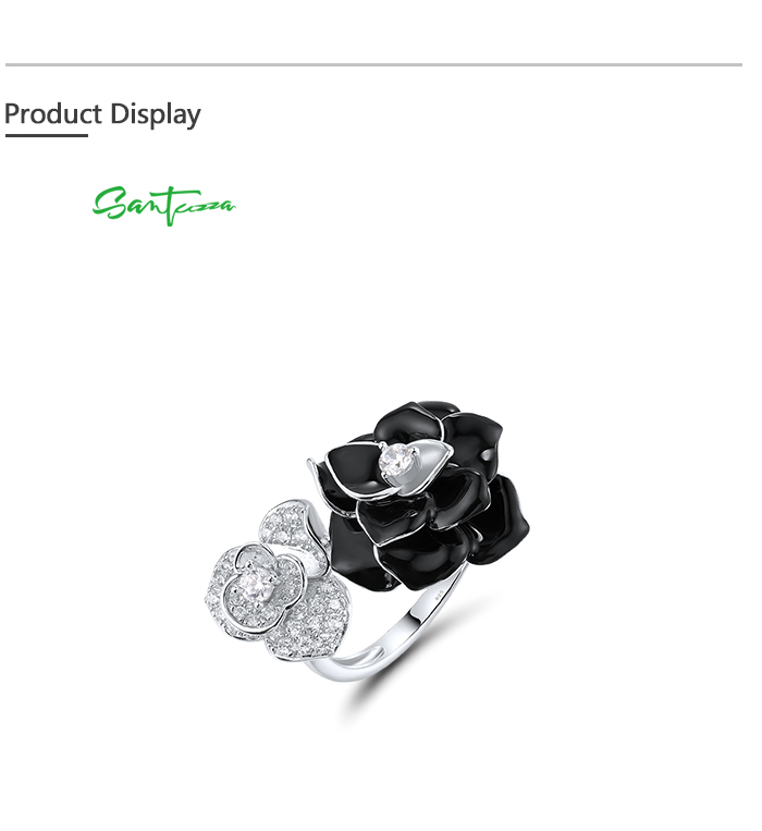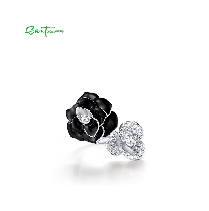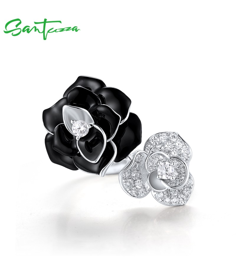 SANTUZZA 925 Sterling Silver Open Ring White CZ White&Black Flower Antique Enamel Jewelry