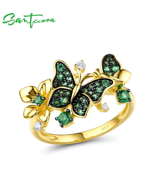 SANTUZZA 925 Sterling Silver Ring Butterfly Gold Color Green Spinel Fine Jewelry