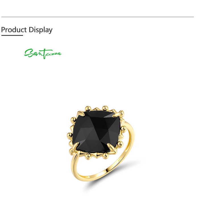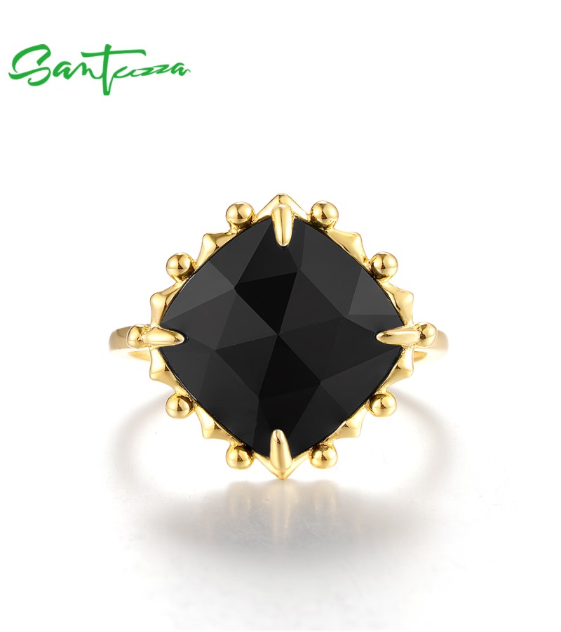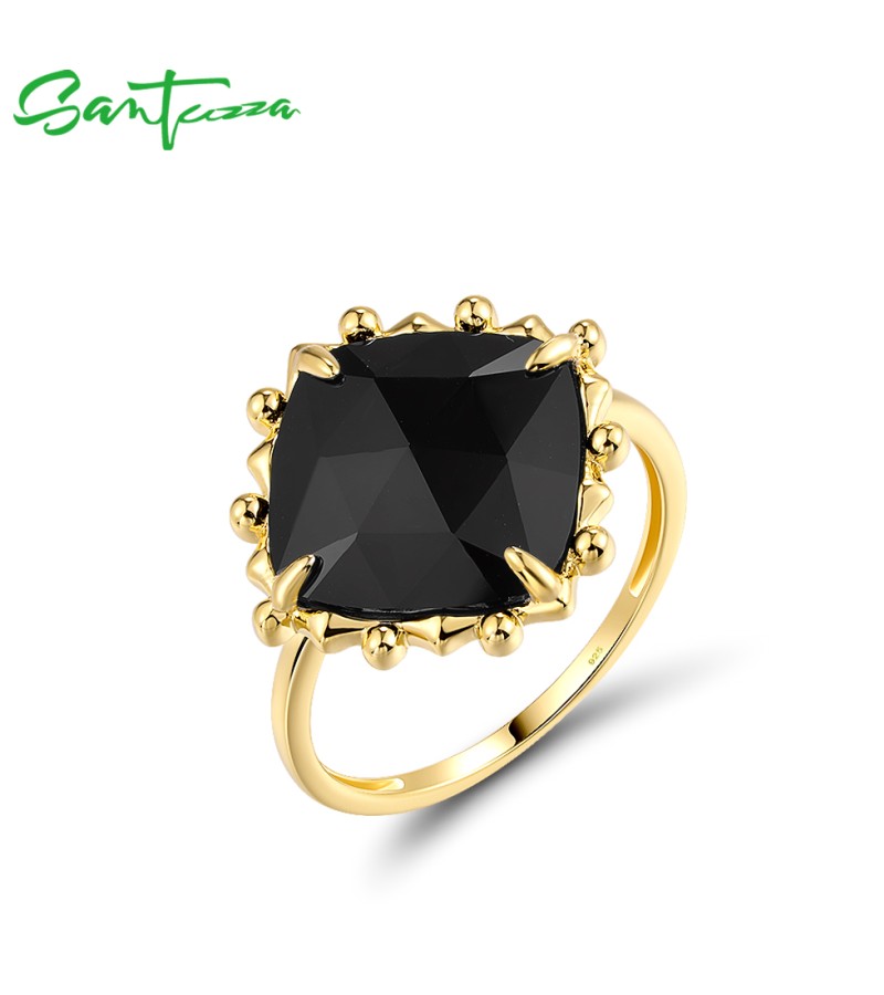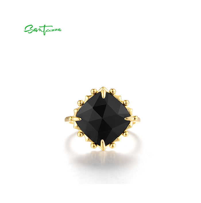 SANTUZZA 925 Sterling Silver Rings For Women Sparkling Black Agate Grand Square Jewelry