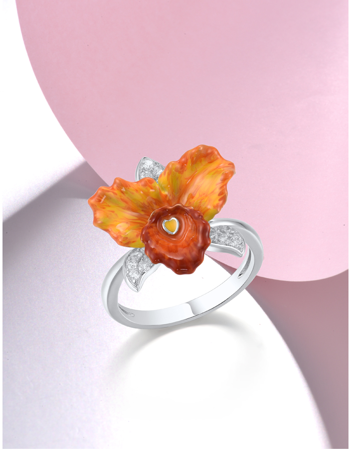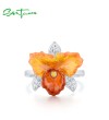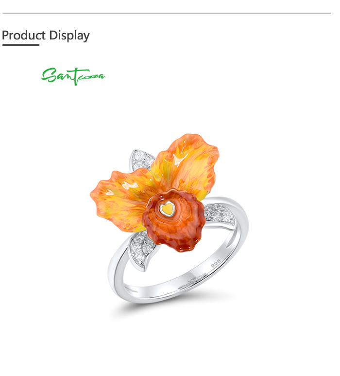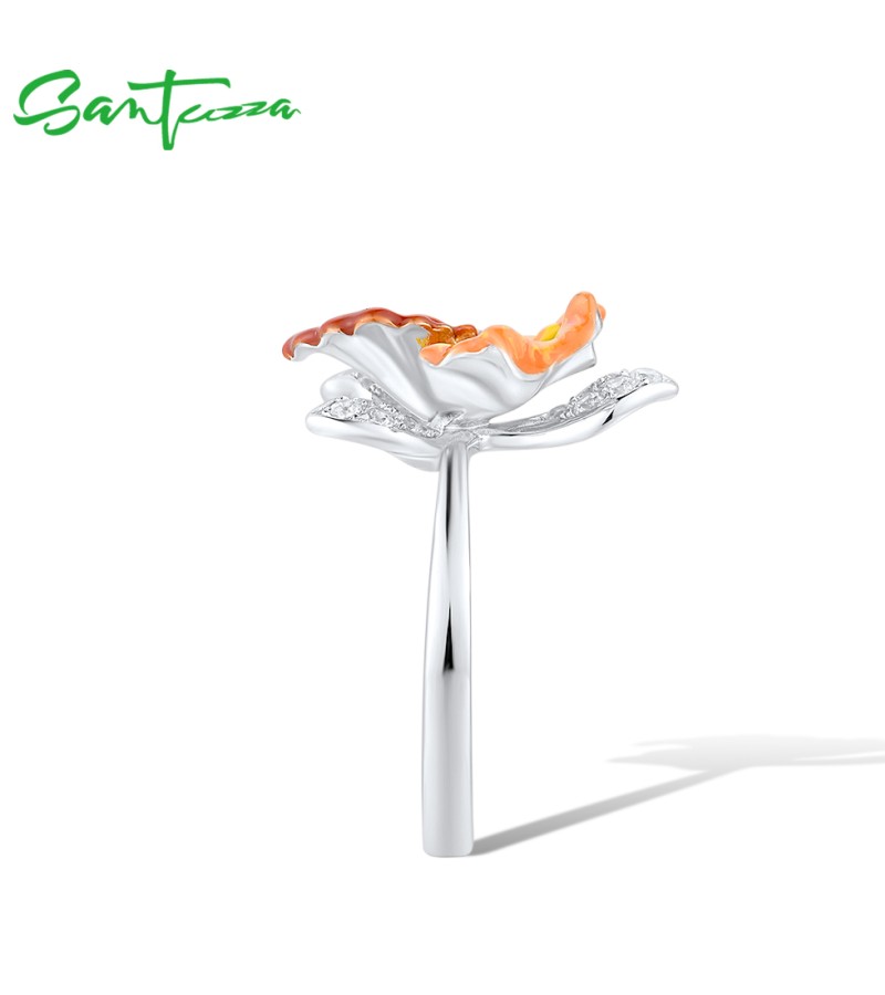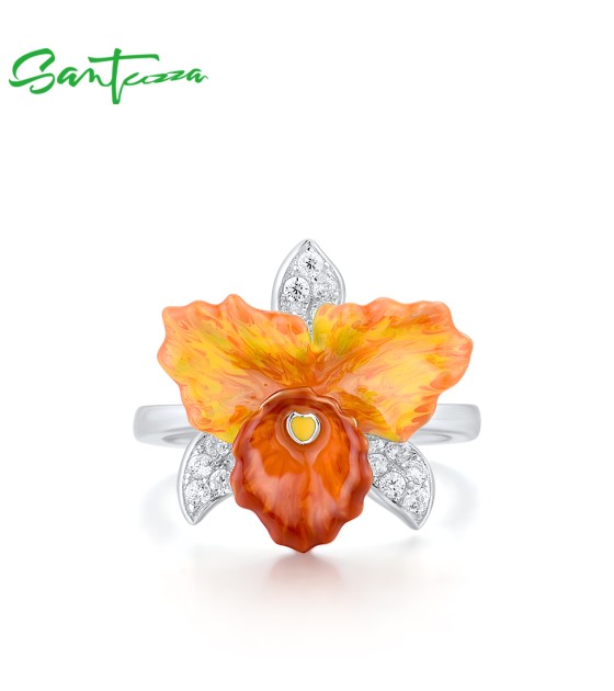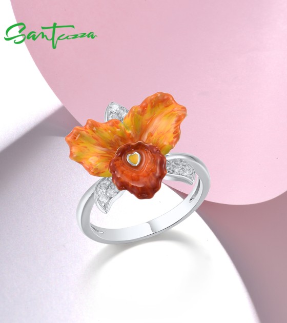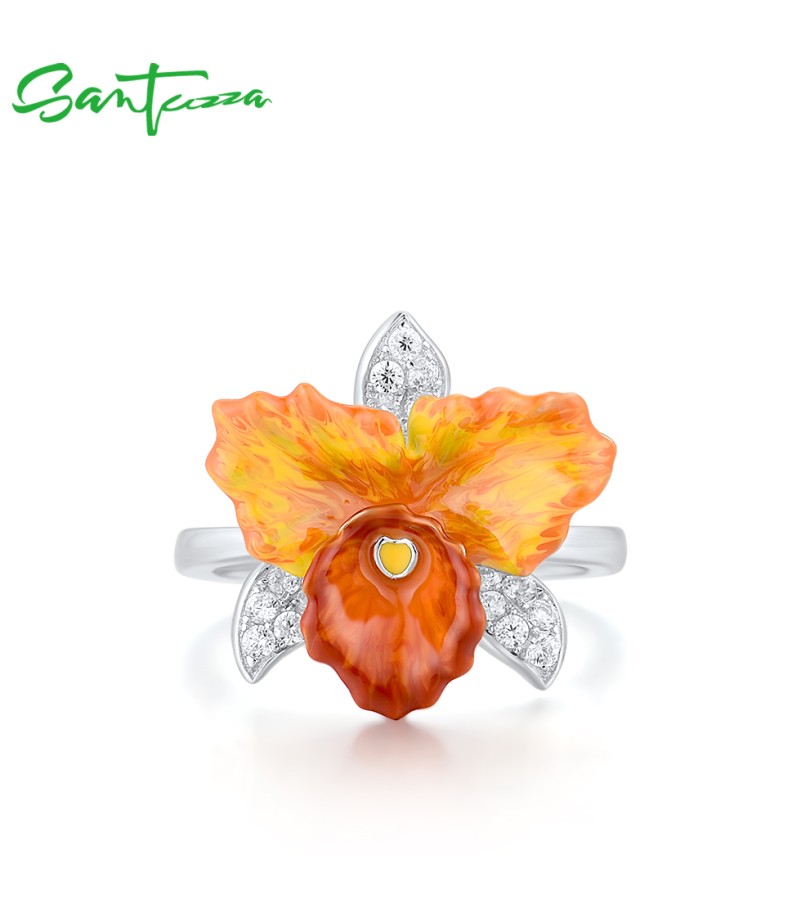 SANTUZZA 925 Sterling Silver Rings Sparkling Orange Orchid Enamel Flower Jewelry