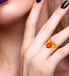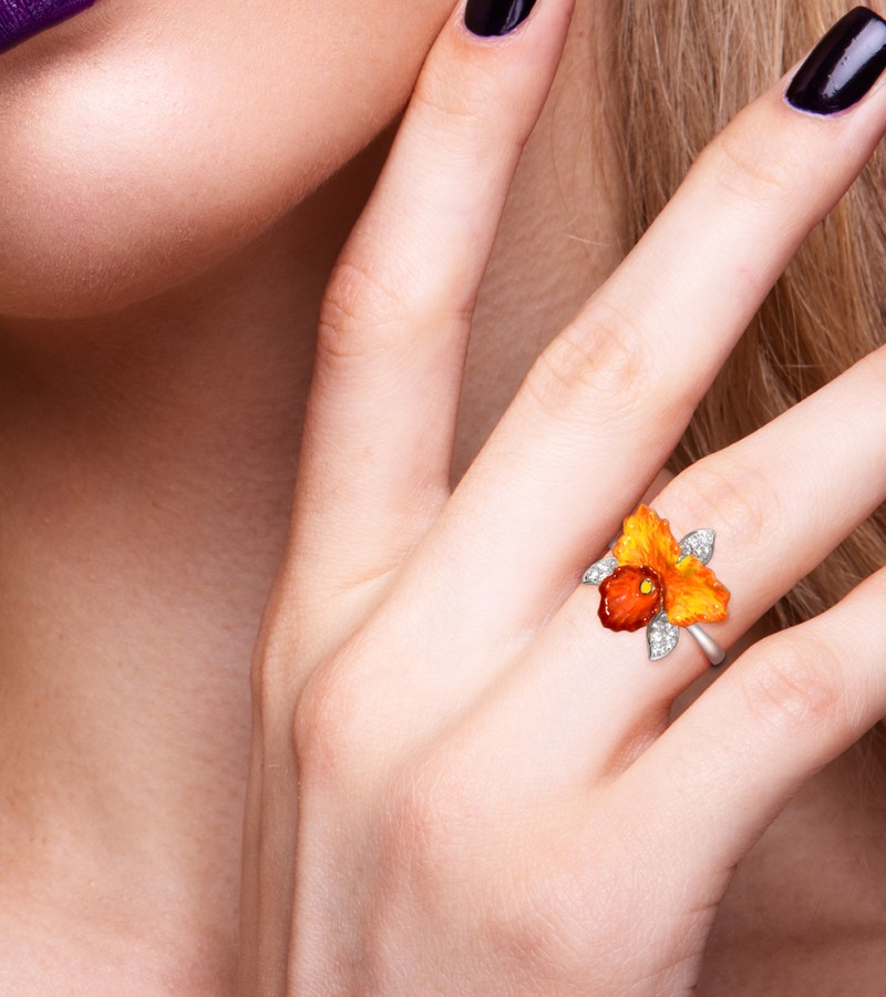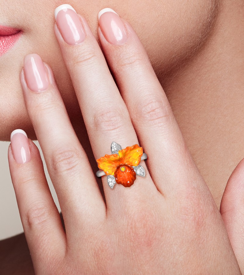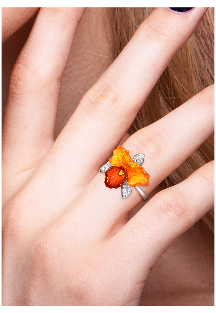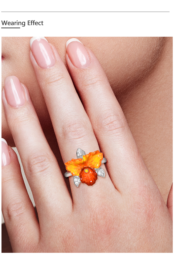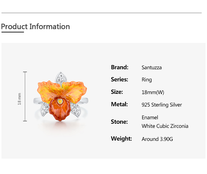 SANTUZZA 925 Sterling Silver Rings Sparkling Orange Orchid Enamel Flower Jewelry