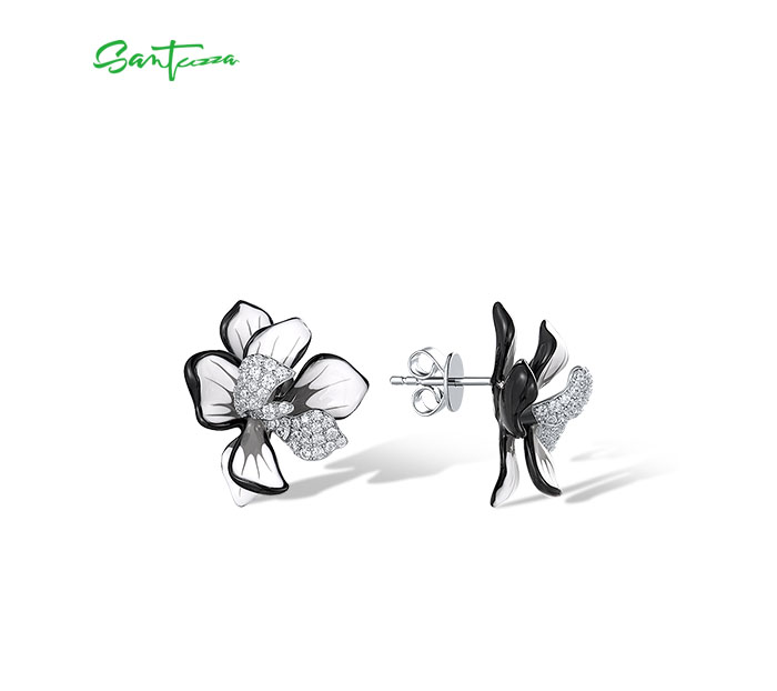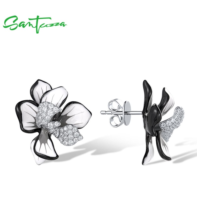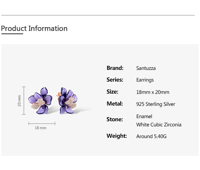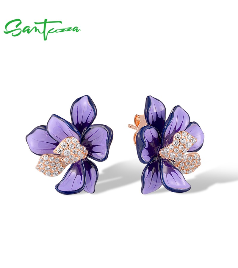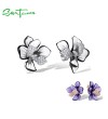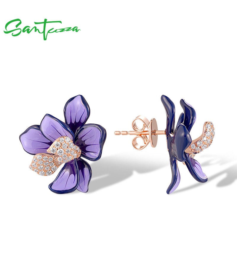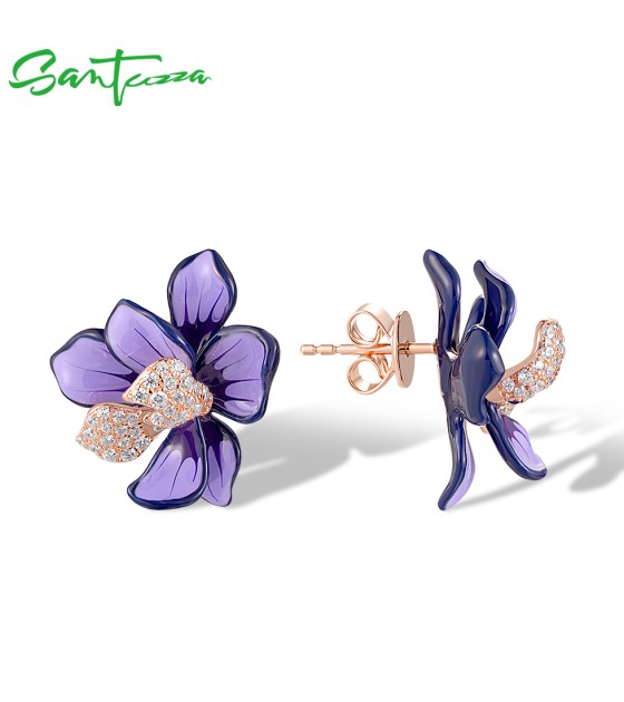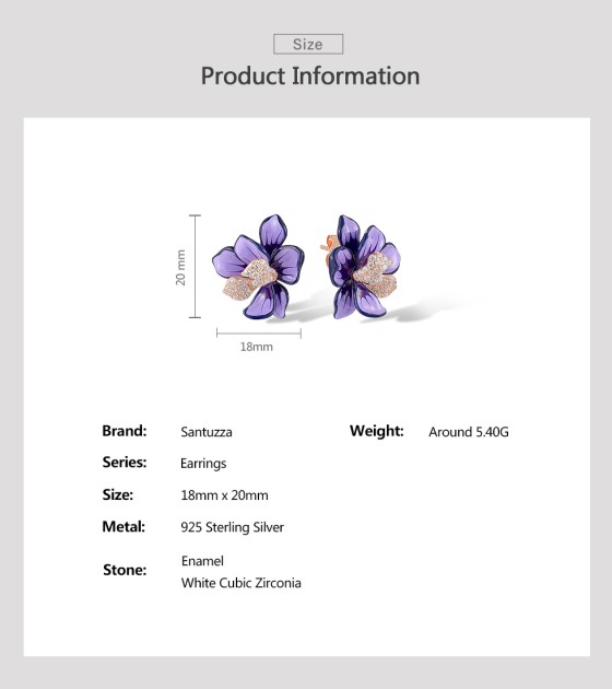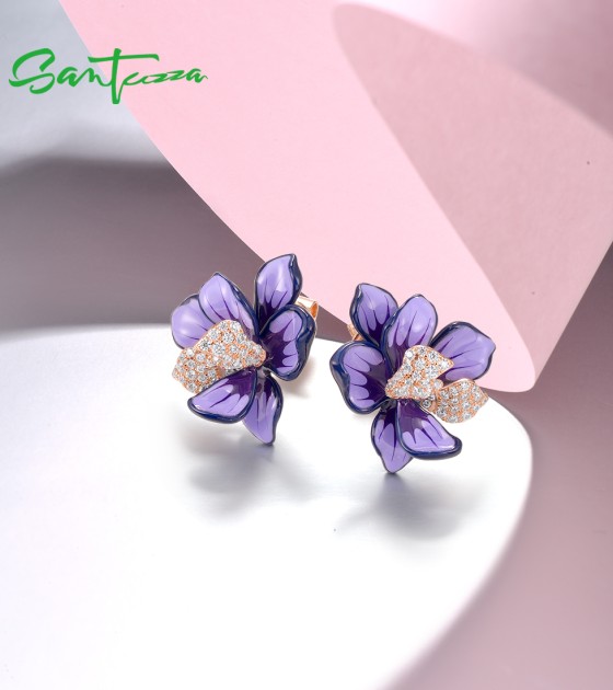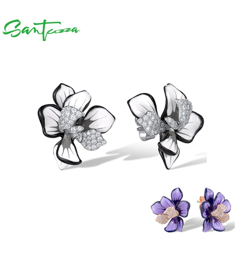 SANTUZZA 925 Sterling Silver Stud Earrings For Women Sparkling Purple & White Enamel Flower Jewelry