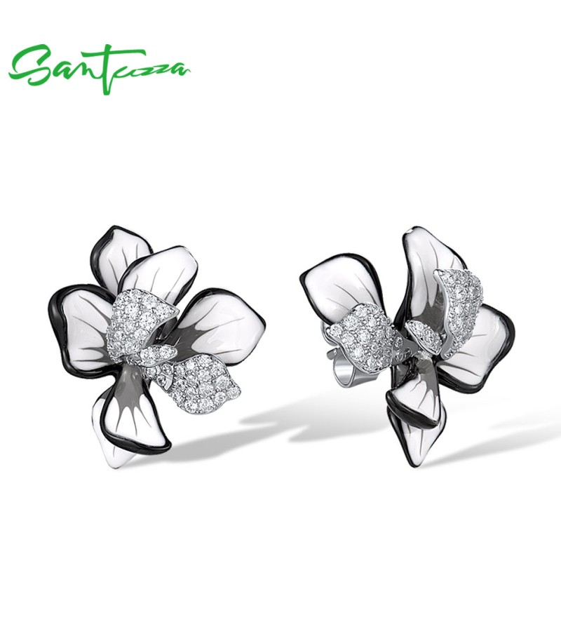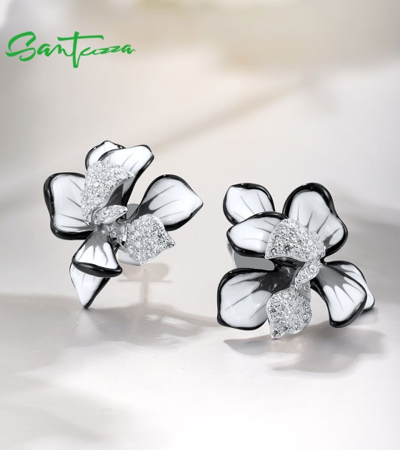 SANTUZZA 925 Sterling Silver Stud Earrings Sparkling White Enamel Flower Jewelry
