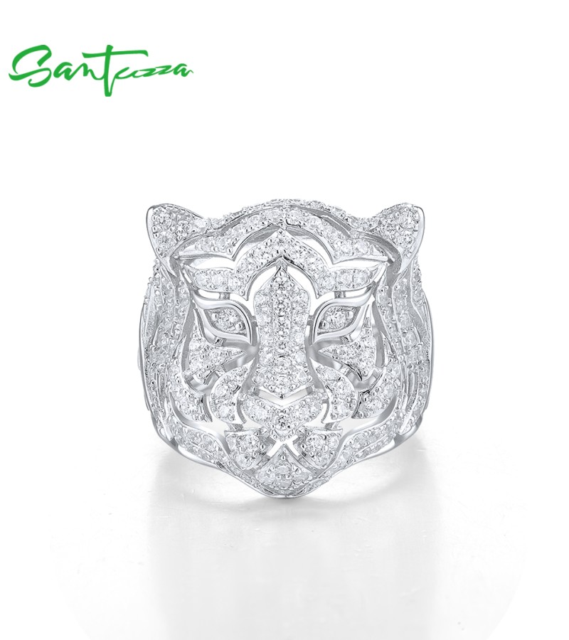 SANTUZZA 925 Sterling Silver Neutral Ring White Cubic Zirconia Cute Tiger Animal Jewelry - US 9