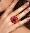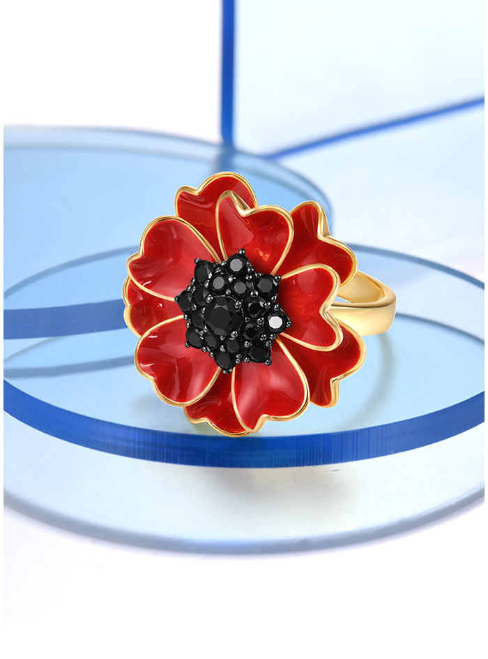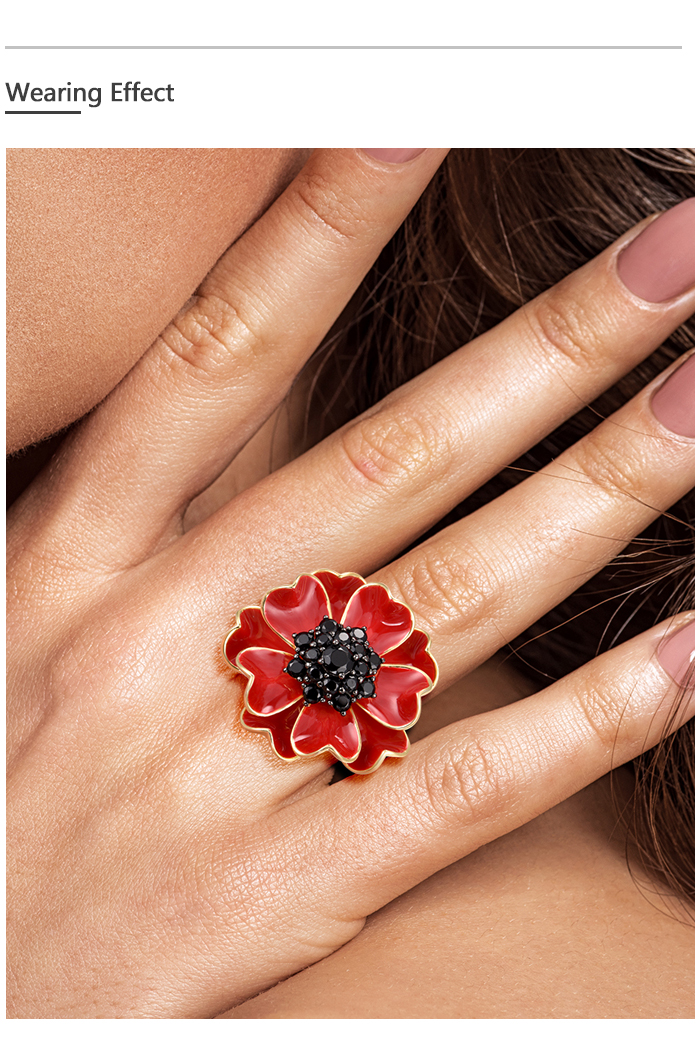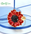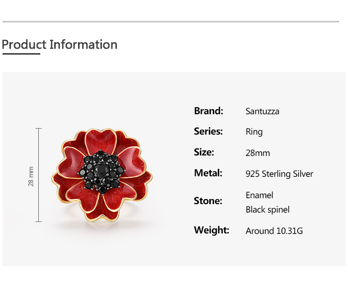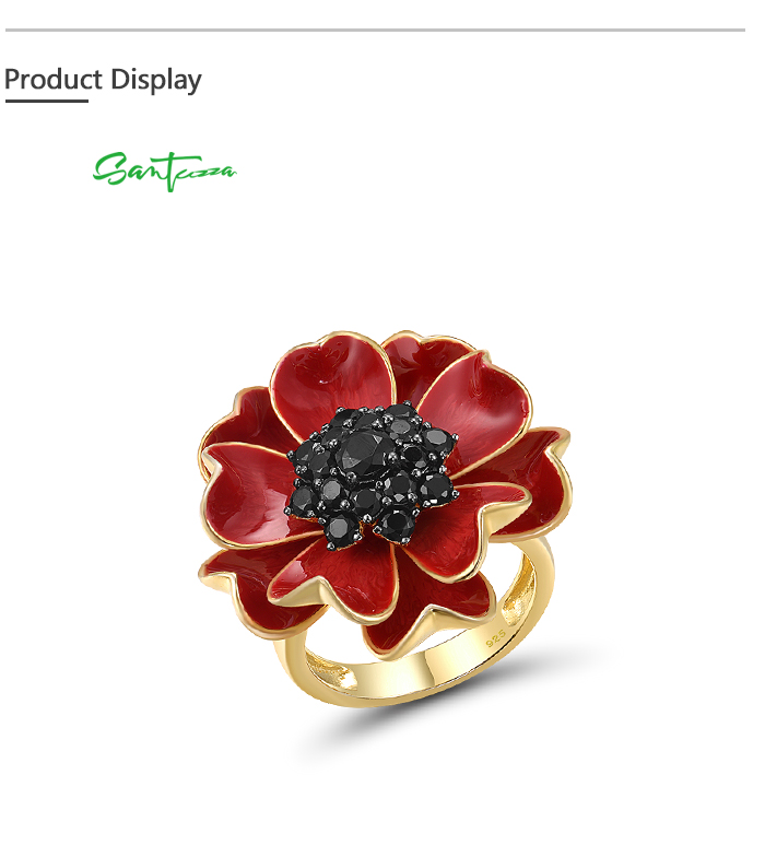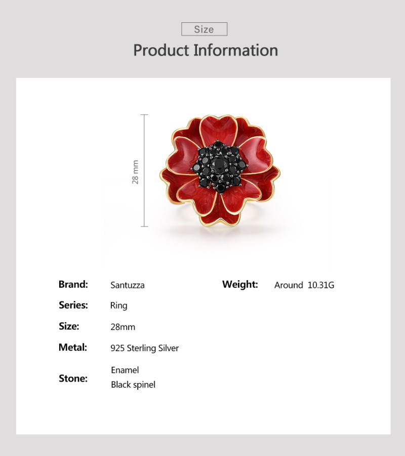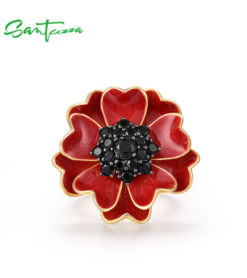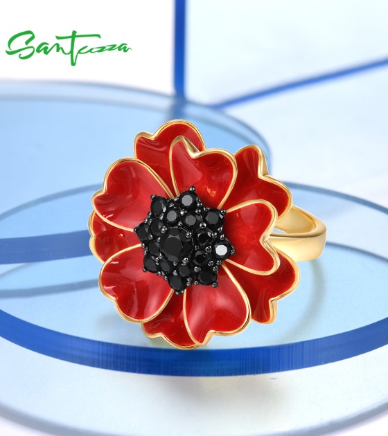SANTUZZA 925 Sterling Silver Rings Black Spinel Red Enamel Blossom Sun Flower Jewelry