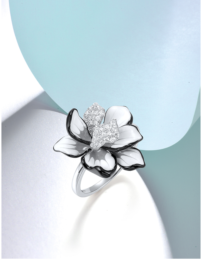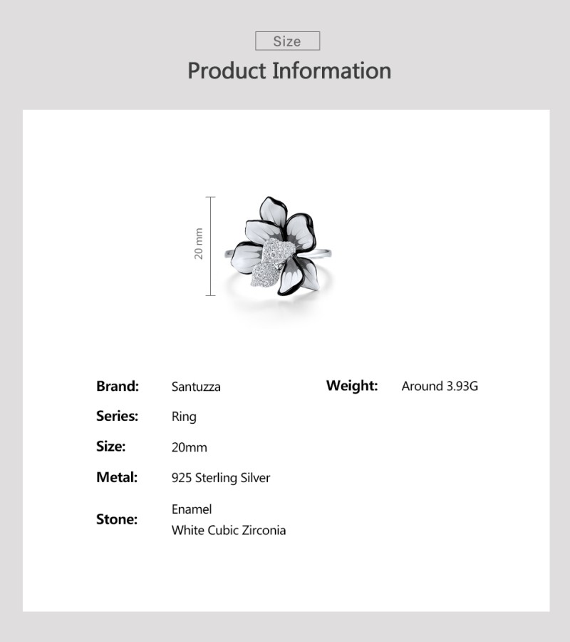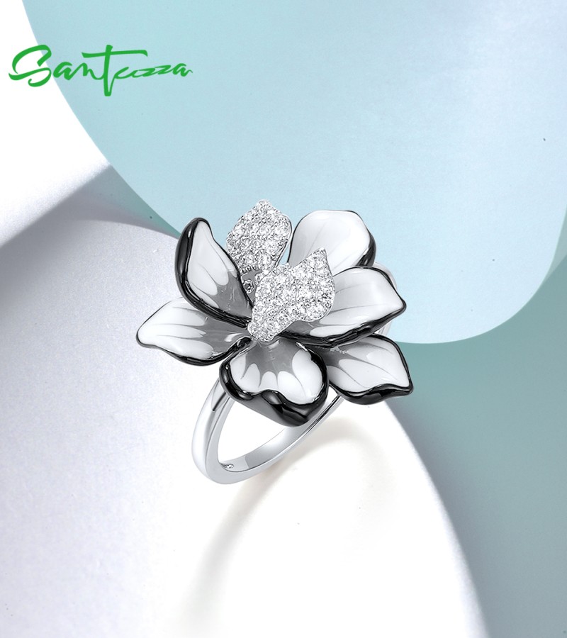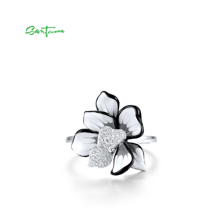 SANTUZZA 925 Sterling Silver Ring Sparkling Zircon White Enamel Flower Jewelry