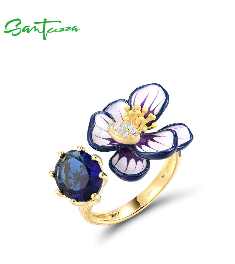 SANTUZZA 925 Sterling Silver Opened Rings Sparkling Blue Stone Enamel Flower Jewelry