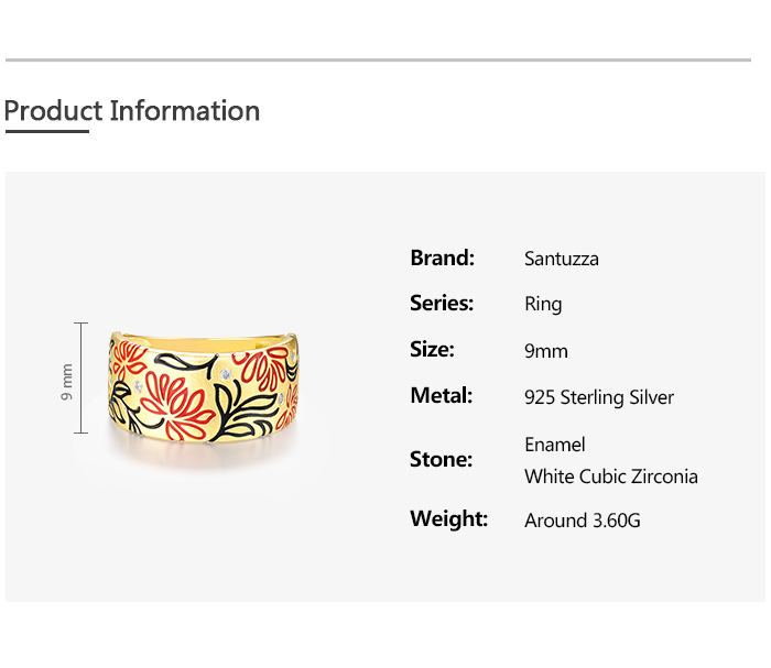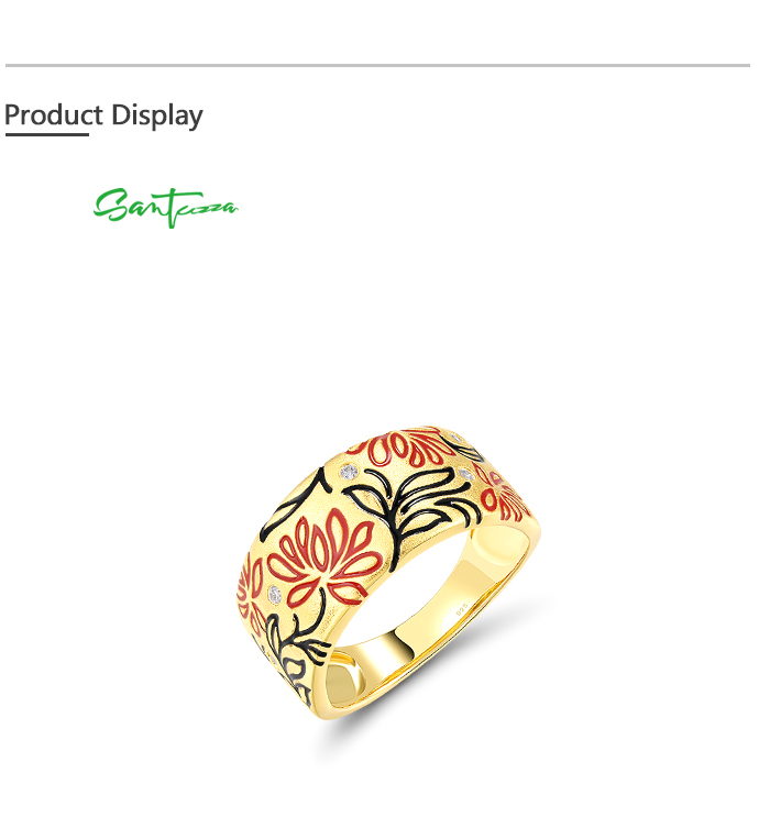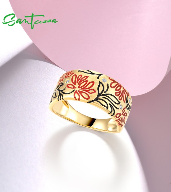 SANTUZZA 925 Sterling Silver Rings Enamel Flower Creative Birthday Daily Gifts Fine Jewelry - Yellow Gold Plating/US 9
